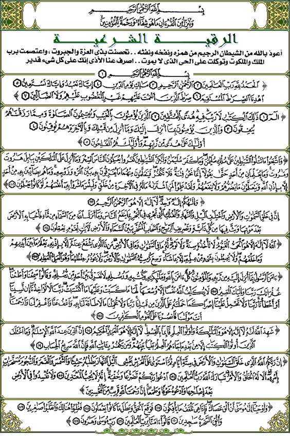 - اقرأ أول سورة البقرة وآية الكرسي وآخر آيتين منها، ويستحب الإكثار من آية الكرسي بين 3 إلى 7 مرات مع النفث.