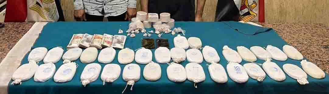 وضبط شخصين بدائرة قسم شرطة بدر، وبحوزتهما كمية من مخدر الحشيش وزنت 2،500 كيلو جرام.