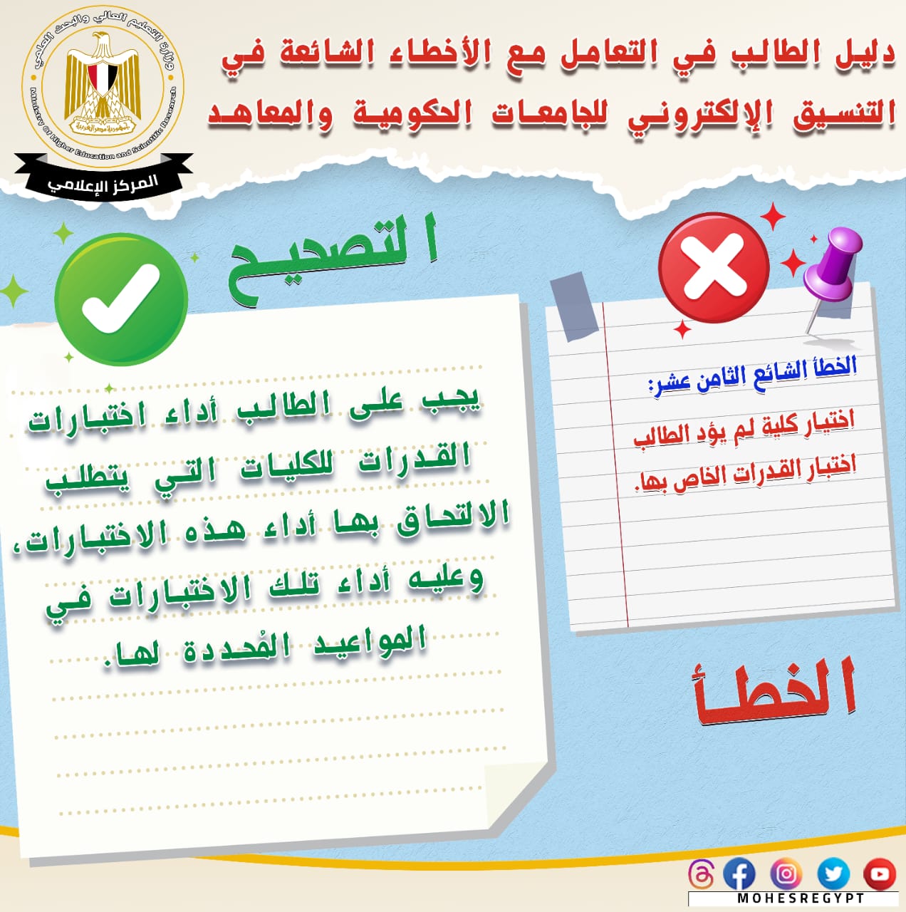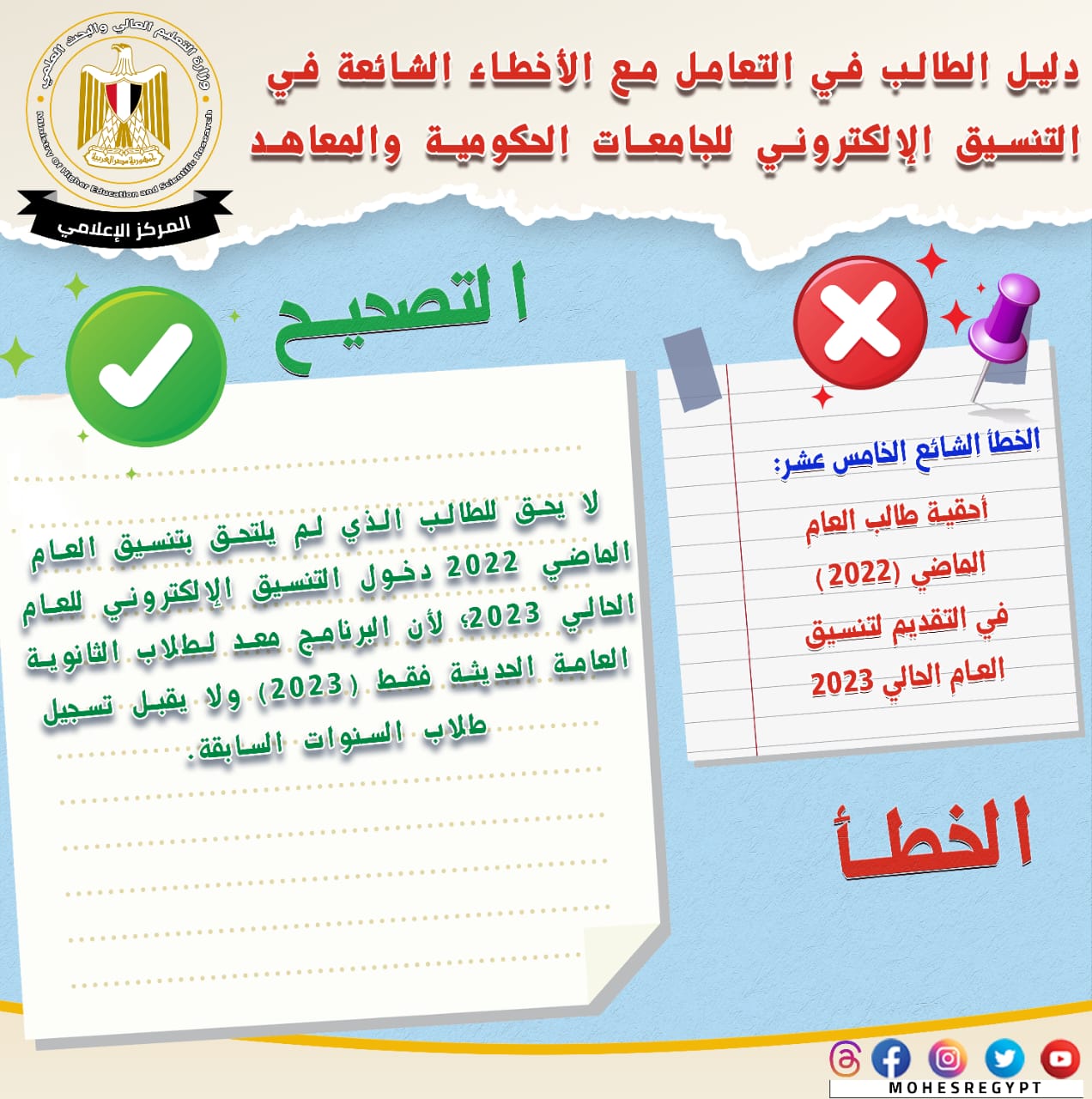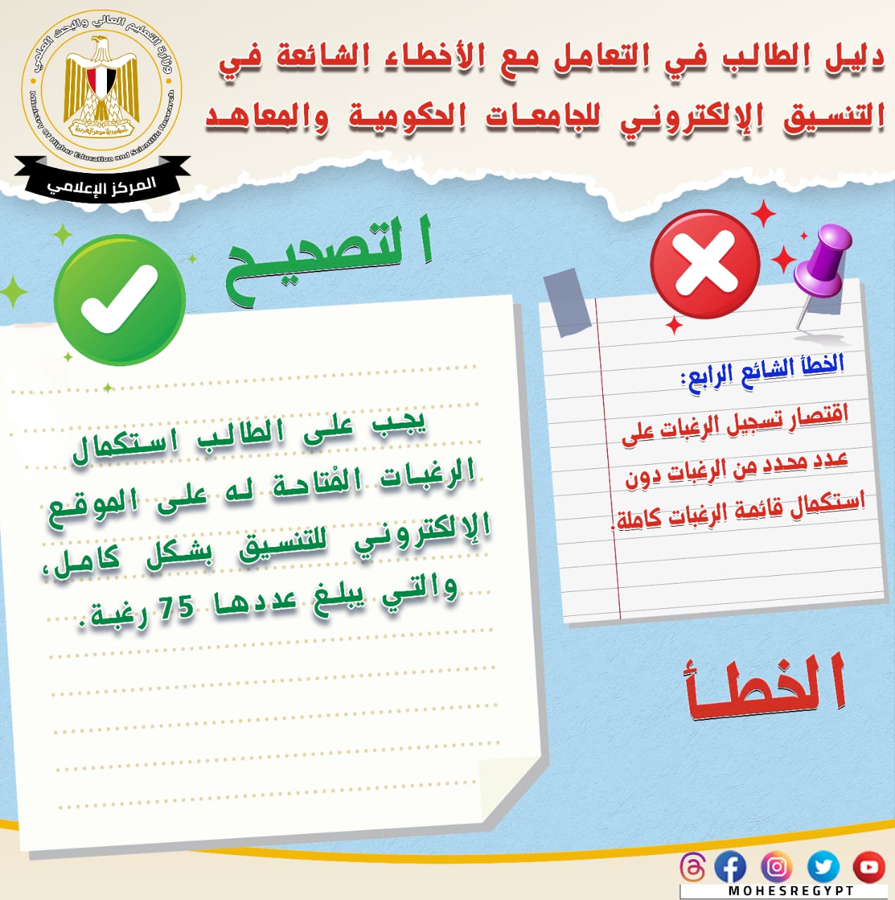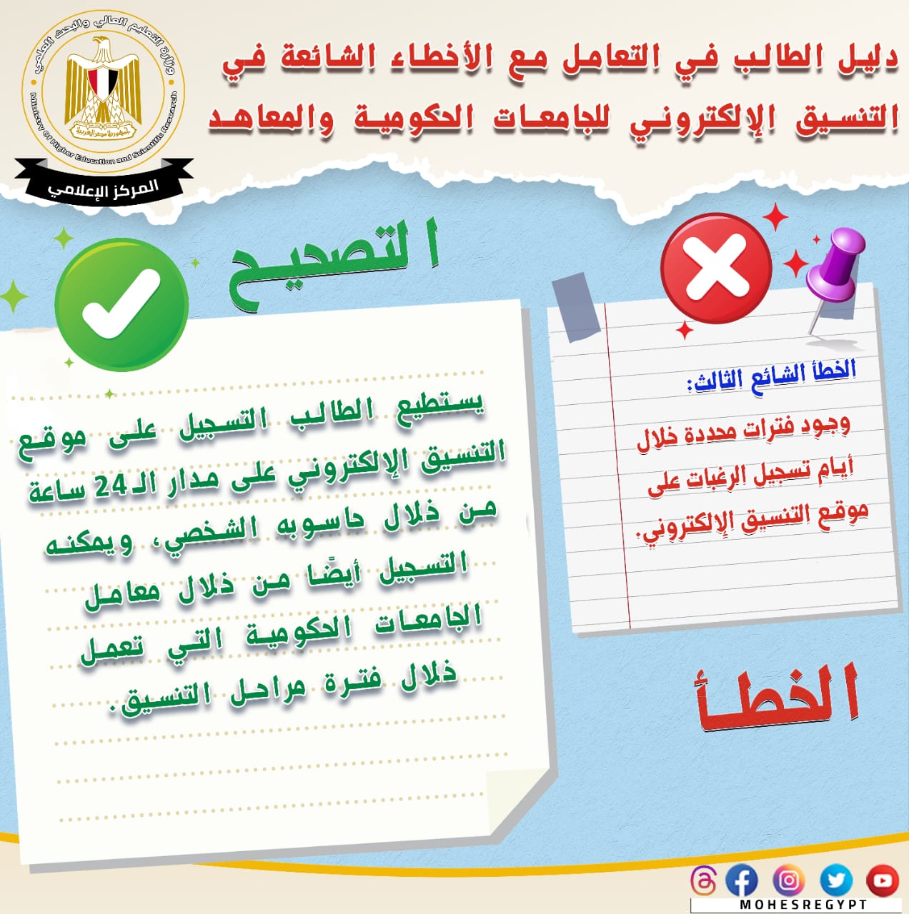 قامت وزارة التعليم العالي والبحث العلمي بإعادة نشر دليل التعامل مع الأخطاء الشائعة في التنسيق الإلكتروني، وذلك تزامنًا مع بدء المرحلة الثانية لتنسيق القبول بالجامعات الحكومية والمعاهد، خلال الفترة من 15 إلى 19 أغسطس الجاري؛ لتعريف الطلاب بكافة المعلومات التي تساعدهم أثناء مراحل التنسيق المُختلفة من خلال حملة التوعية التي تقدمها الوزارة.