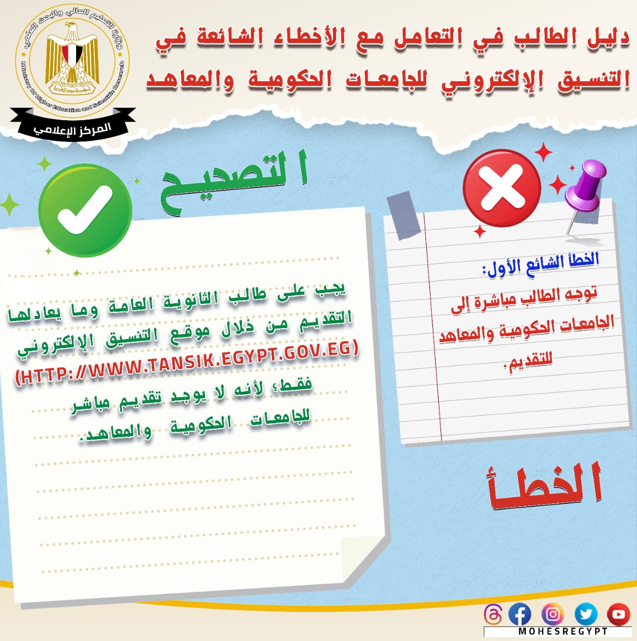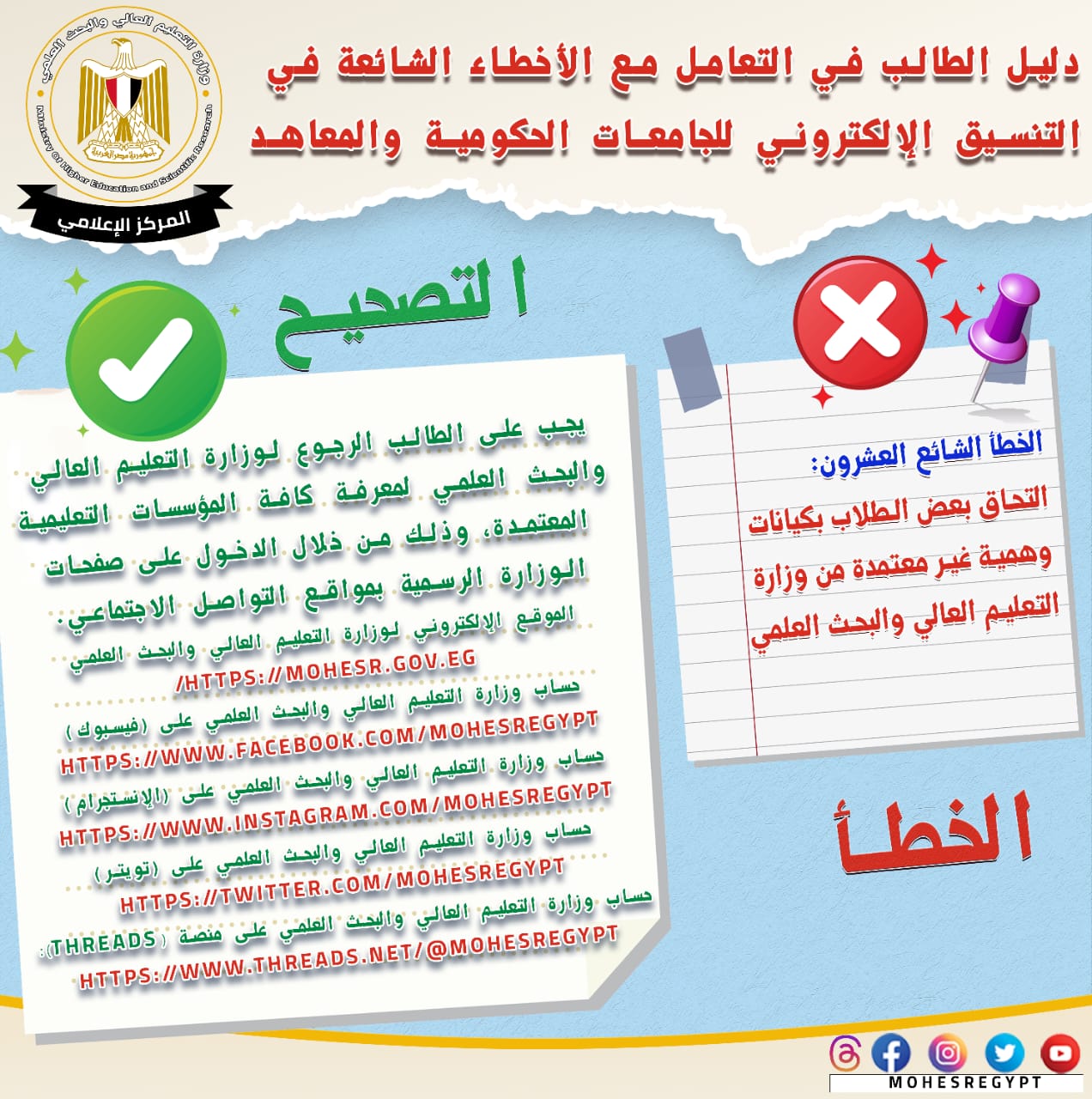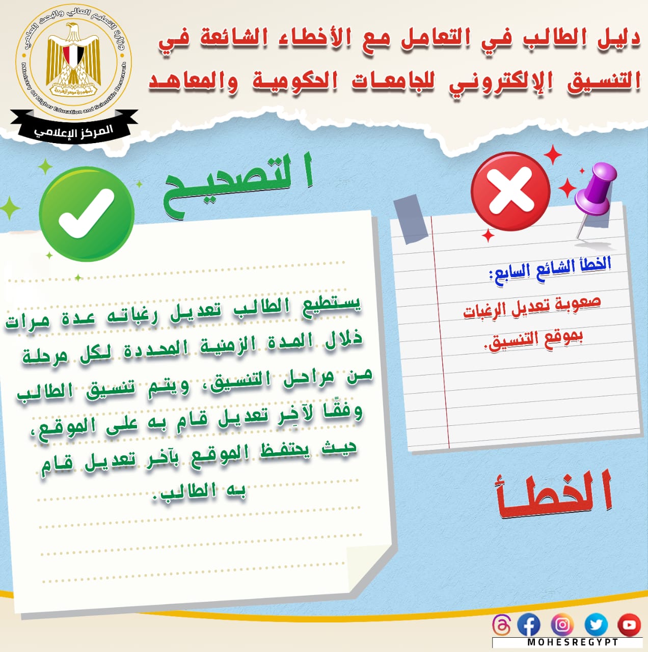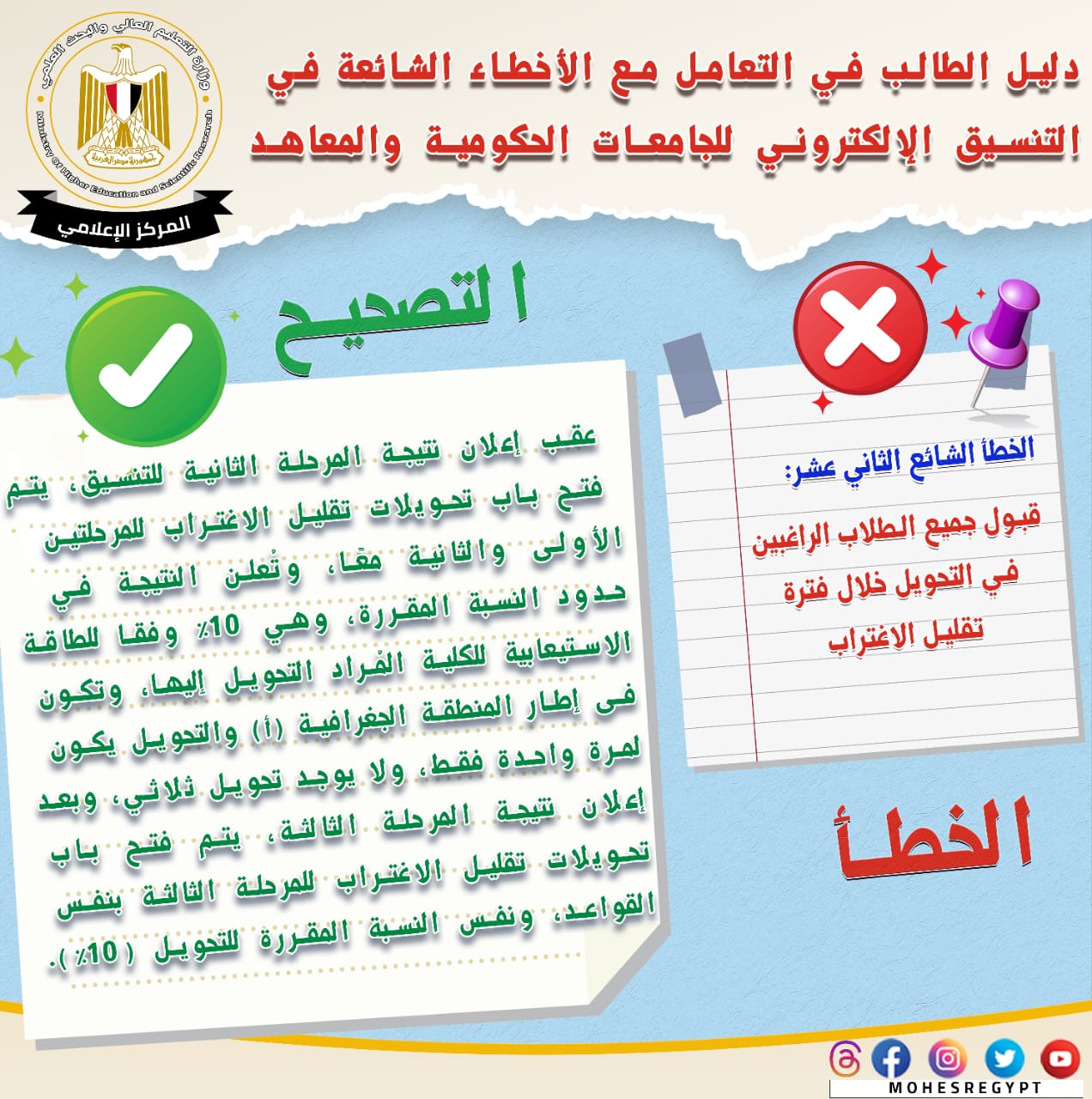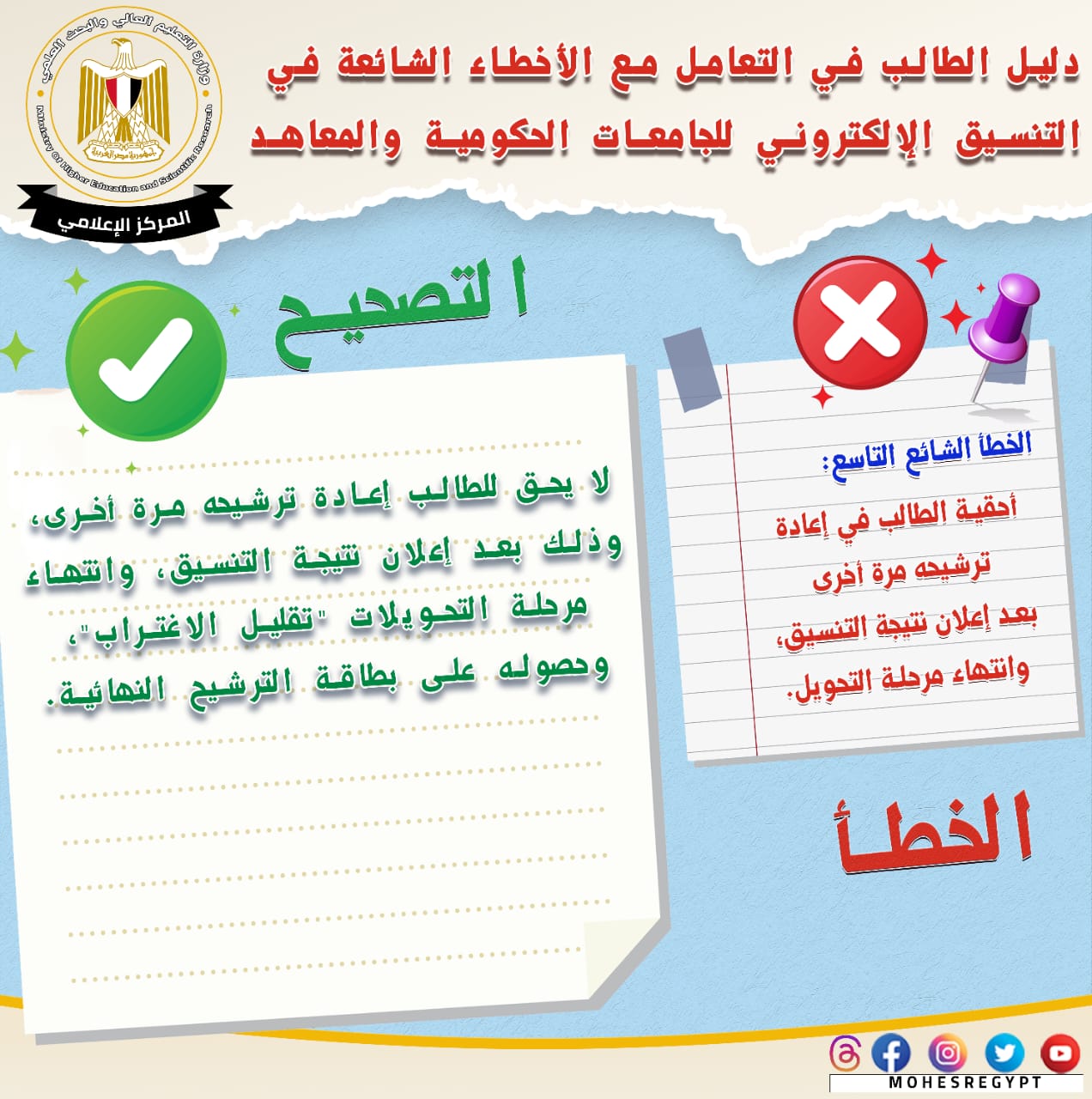 قامت وزارة التعليم العالي والبحث العلمي بإعادة نشر دليل التعامل مع الأخطاء الشائعة في التنسيق الإلكتروني، وذلك تزامنًا مع بدء المرحلة الثانية لتنسيق القبول بالجامعات الحكومية والمعاهد، خلال الفترة من 15 إلى 19 أغسطس الجاري؛ لتعريف الطلاب بكافة المعلومات التي تساعدهم أثناء مراحل التنسيق المُختلفة من خلال حملة التوعية التي تقدمها الوزارة.