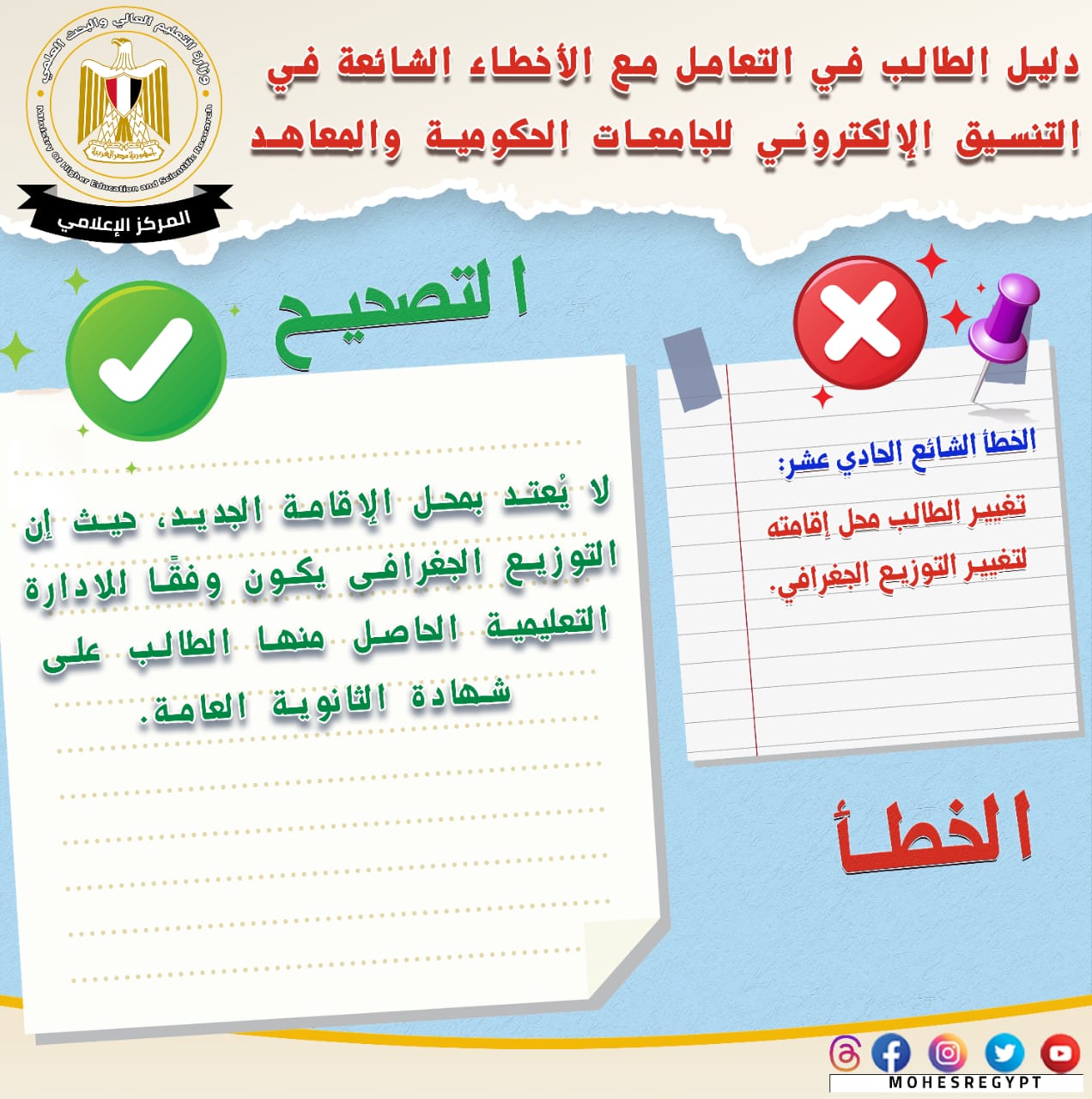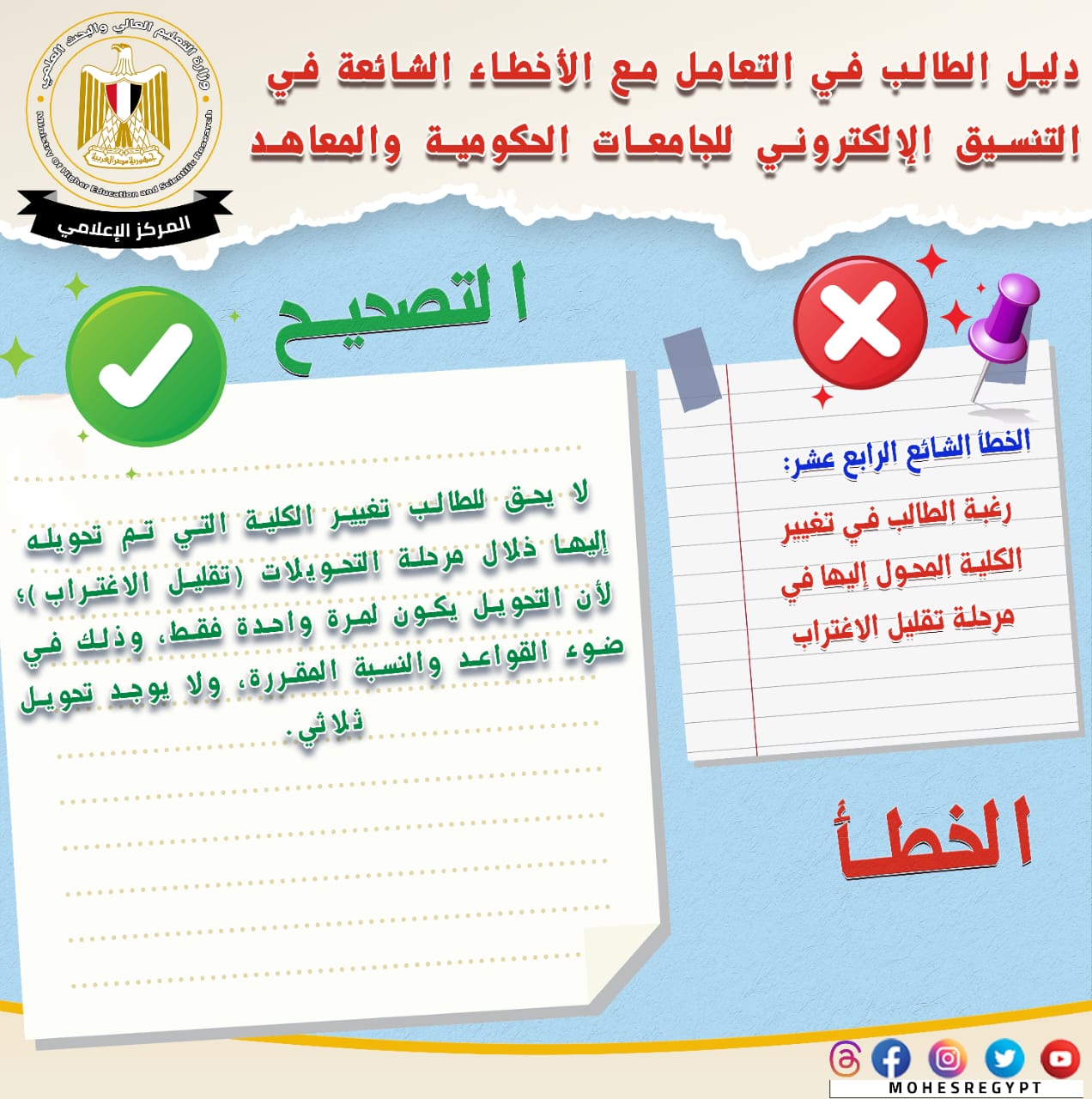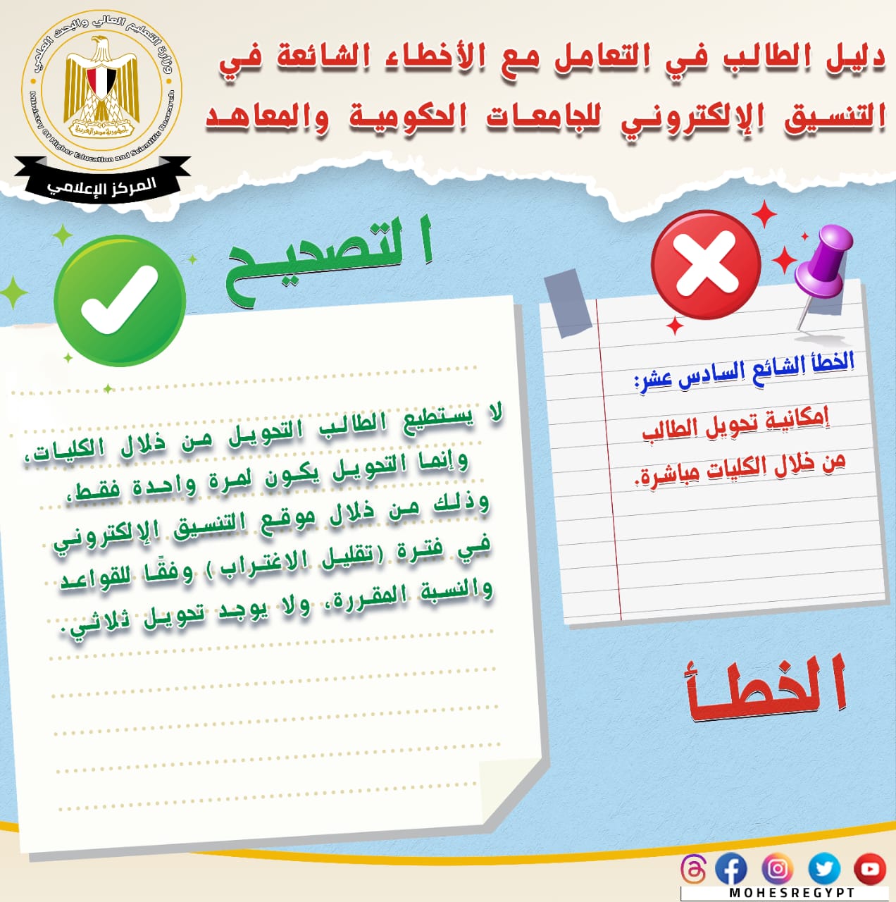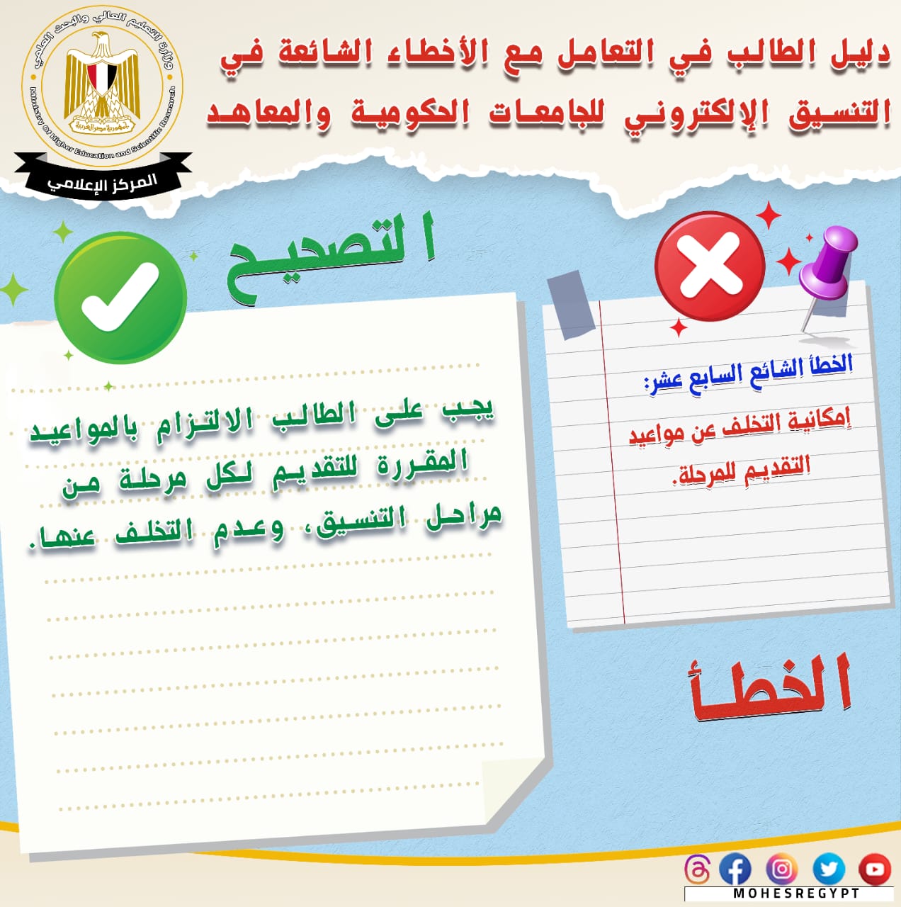 قامت وزارة التعليم العالي والبحث العلمي بإعادة نشر دليل التعامل مع الأخطاء الشائعة في التنسيق الإلكتروني، وذلك تزامنًا مع بدء المرحلة الثانية لتنسيق القبول بالجامعات الحكومية والمعاهد، خلال الفترة من 15 إلى 19 أغسطس الجاري؛ لتعريف الطلاب بكافة المعلومات التي تساعدهم أثناء مراحل التنسيق المُختلفة من خلال حملة التوعية التي تقدمها الوزارة.