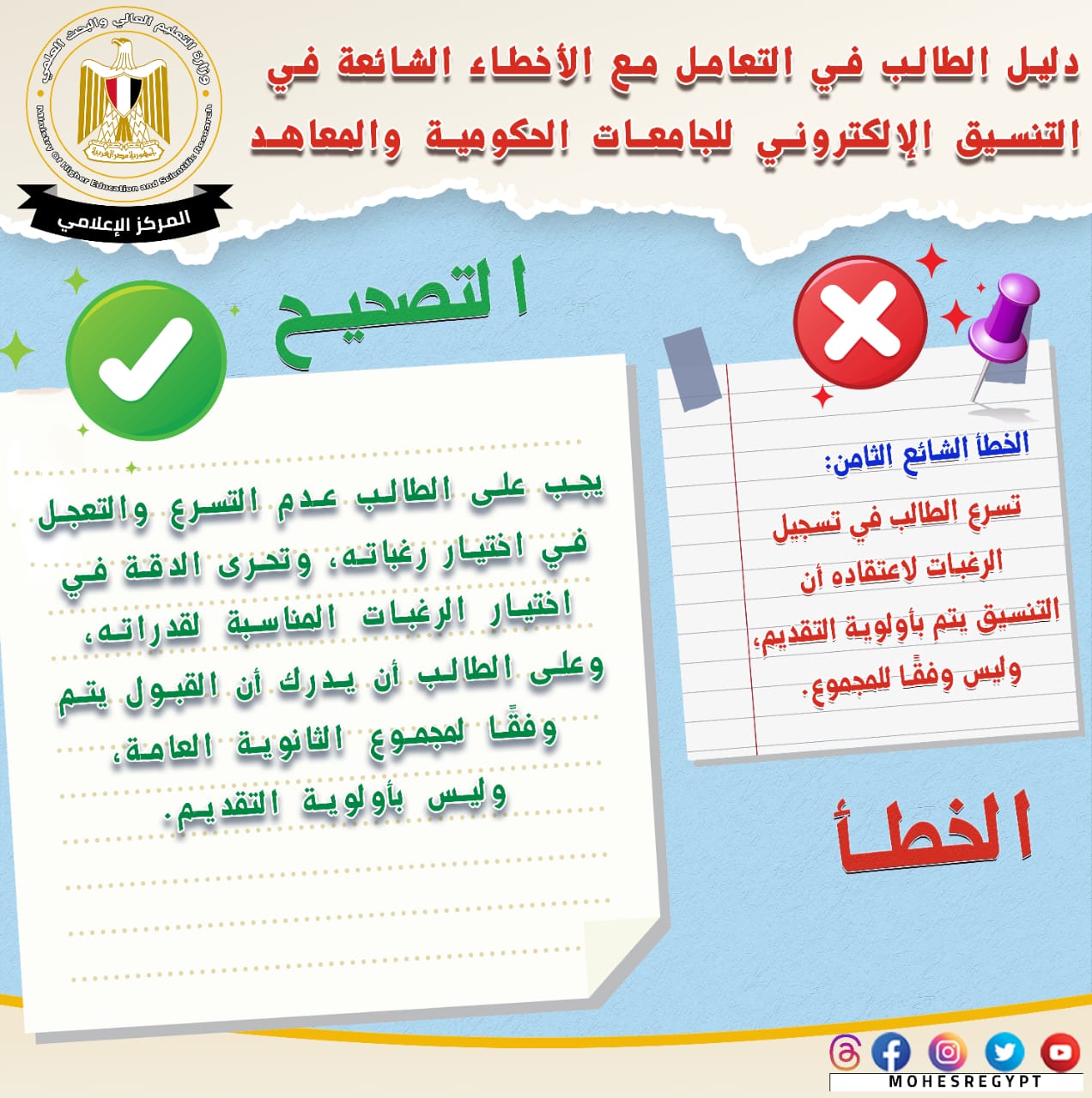 وأضاف المتحدث الرسمي أن الدليل الحالي يتضمن أبرز الأخطاء الشائعة التي يقع فيها طلاب الثانوية العامة، وكيفية التعامل الصحيح مع هذه الأخطاء؛ لتجنب الوقوع فيها خلال فترة التنسيق للالتحاق بالجامعات الحكومية والمعاهد.