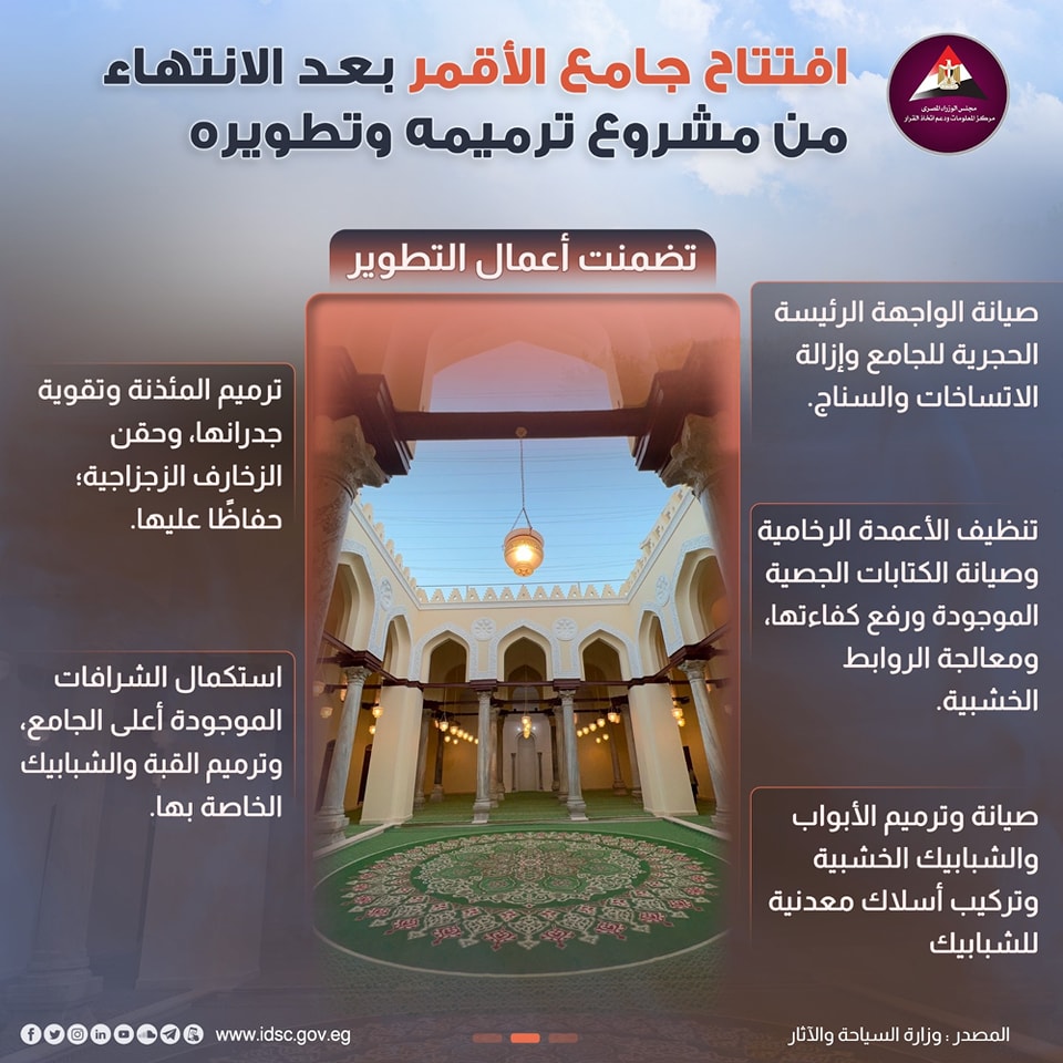 نشر مركز المعلومات ودعم اتخاذ القرار بمجلس الوزراء، انفوجراف، احتفاء بافتتاح جامع الأقمر بعد الانتهاء من مشروع ترميمه وتطويره، يأذتى ذلك في إطار ما يشهده قطاع الآثار الإسلامية والقبطية واليهودية من إنجازات كبيرة في الآونة الأخيرة.