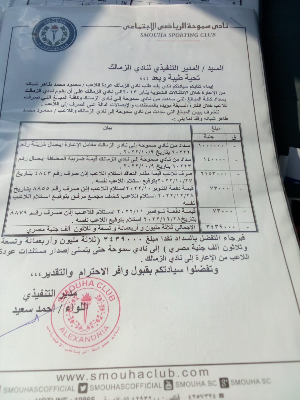 أرسل نادي سموحة خطابًا رسميًا إلى نادي الزمالك، يطالبه خلاله بسداد مبلغ 3 ملايين و440 ألف جنيه بعد عودة محمود شبانة إلى الفريق الأبيض وقطع إعارته إلى الفريق السكندري في يناير الماضي.