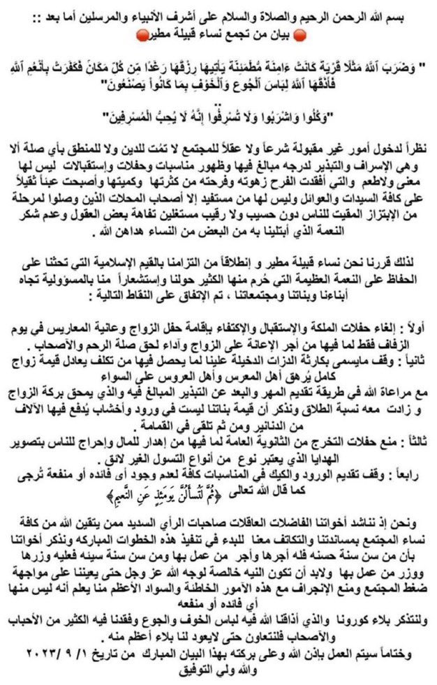 كما ذكر البيان إلغاء حفلات الملچة ومنع حفلات التخرج من الثانوية العامة، وكذلك وقف تقديم الورود والكيك في المناسبات كافة لعدم وجود منفعة أو فائدة، ومراعاة الله بطريقة تقديم المهر.