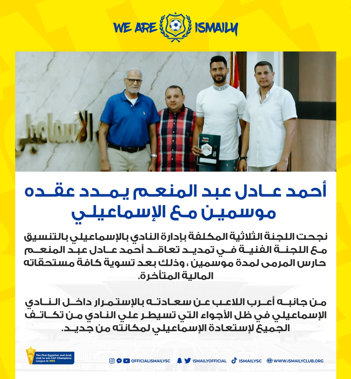 نجحت اللجنة الثلاثية المكلفة بإدارة النادي الإسماعيلي بالتنسيق مع اللجنة الفنية في تمديد تعاقد أحمد عادل عبد المنعم حارس المرمى لمدة موسمين، وذلك بعد تسوية كافة مستحقاته المالية المتأخرة.