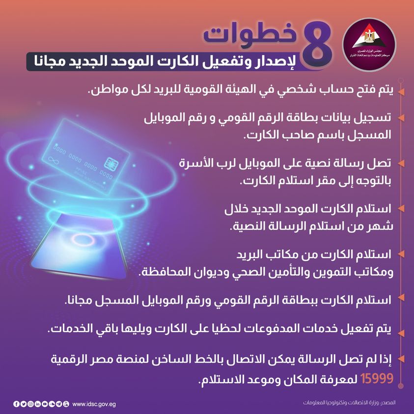 كشف مركز المعلومات ودعم اتخاذ القرار التابع لـ مجلس الوزراء عن خطوات إصدار وتفعيل الكارت الموحد الجديد.