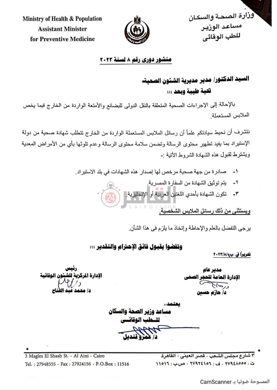 وأفادت وزارة الصحة والسكان، في منشورها حصل القاهرة 24 على نسخة منه، أن شروط قبول الشهادة الصحية المطلوبة من الدولة المستورد منها رسائل أو بضائع الملابس المستعملة الواردة من الخارج، تفيد بتطهير محتوى البضاعة وسلامتها وعدم تلوثها بأي من الأمراض المعدية.