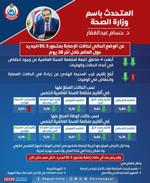 أعلنت وزارة الصحة في بيان رسمي لها أنه لم يتم رصد أي حالات إصابة بمتحور EG.5 الجديد داخل مصر حتى الآن.
