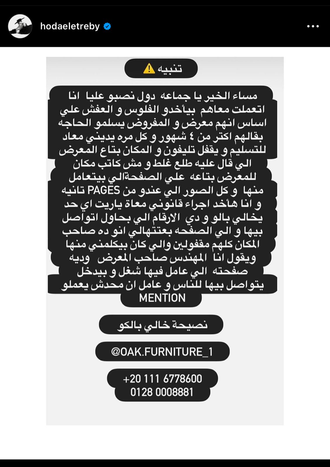 وقالت الفنانة هدى الإتربي، عبر حسابها الشخصي بموقع التواصل الاجتماعي انستجرام: مساء الخير يا جماعة دول نصبوا عليا أنا تعاملت معاهم بياخدوا الفلوس والعفش على أساس أنهم معرض، والمفروض يسلموا الحاجة بقالهم أكتر من 4 شهور وكل مرة يديني معاد للتسليم ويقفل تليفونه.