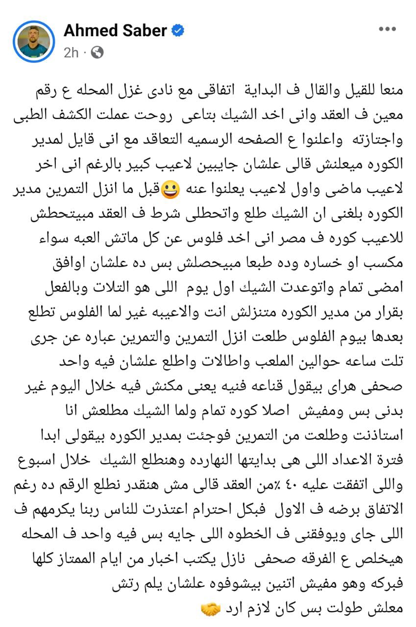 وقال صابر في منشوره: منعا للقيل والقال فالبداية اتفاقي مع نادي غزل المحلة على رقم معين في العقد وإنى آخد الشيك بتاعي، روحت عملت الكشف الطبي واجتزته، وأعلنوا على الصفحة الرسمية التعاقد مع إنى قلت لمدير الكرة ميعلنش قالي علشان جايبين لاعب كبير بالرغم إنى آخر لاعب ماضي وأول لاعب يعلنوا عنه.