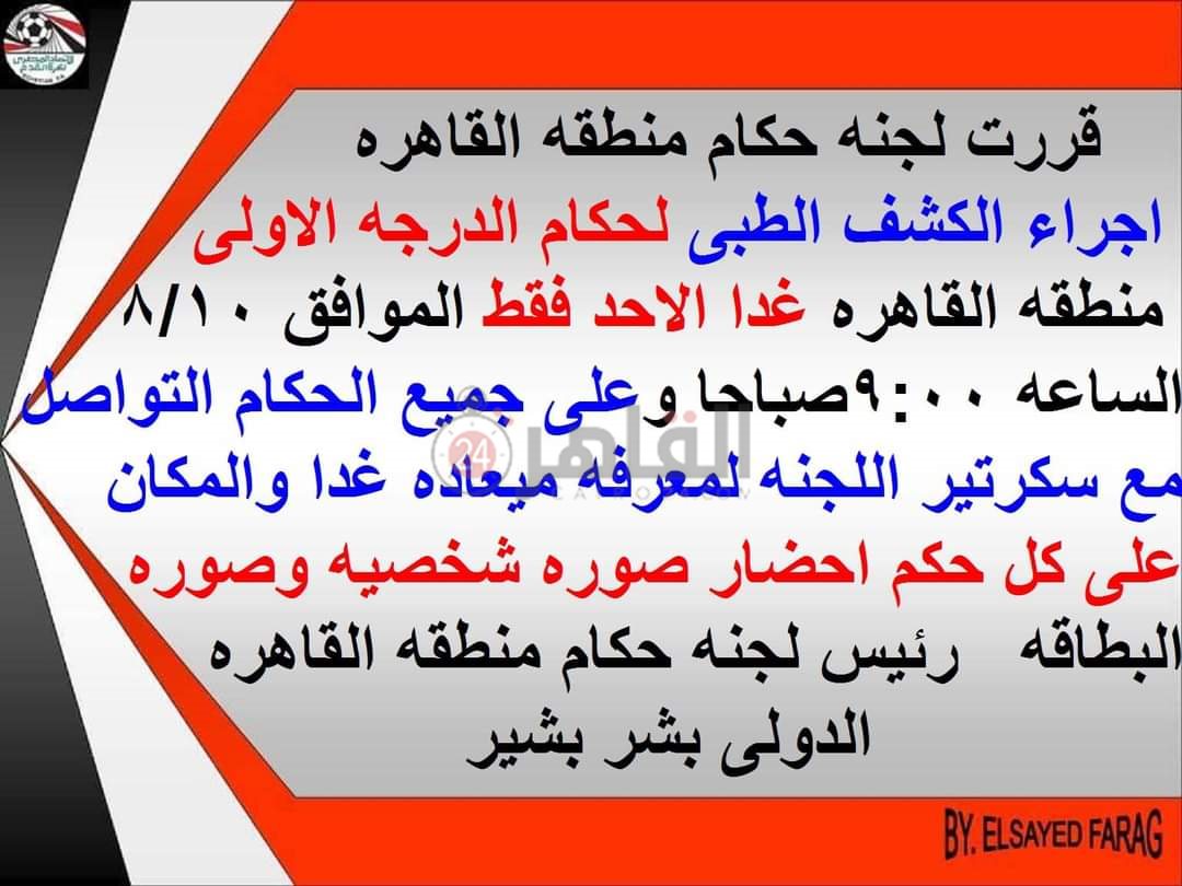 وأرسلت لجنة الحكام الفرعية التابعة لمنطقة كرة القدم بالقاهرة إعلانا لحكام المنطقة تخطرهم فيه بإقامة الكشف الطبي لهم غدًا، لكن دون أن يتضمن الإعلان تحديد مكان إقامة الكشف الطبي أو توقيته على وجه الدقة، حيث طالب الإعلان الحكام بالتواصل تليفونيًا مع سكرتير لجنة الحكام الفرعية بالقاهرة لمعرفة مكان وتوقيت الكشف الطبي.