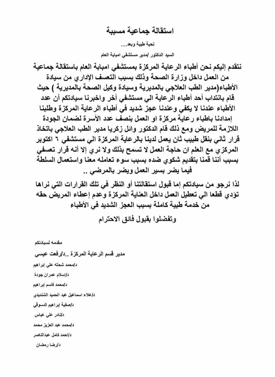 وقائع إهمال طبيب الاستقالة الجماعية بمستشفى إمبابة العام