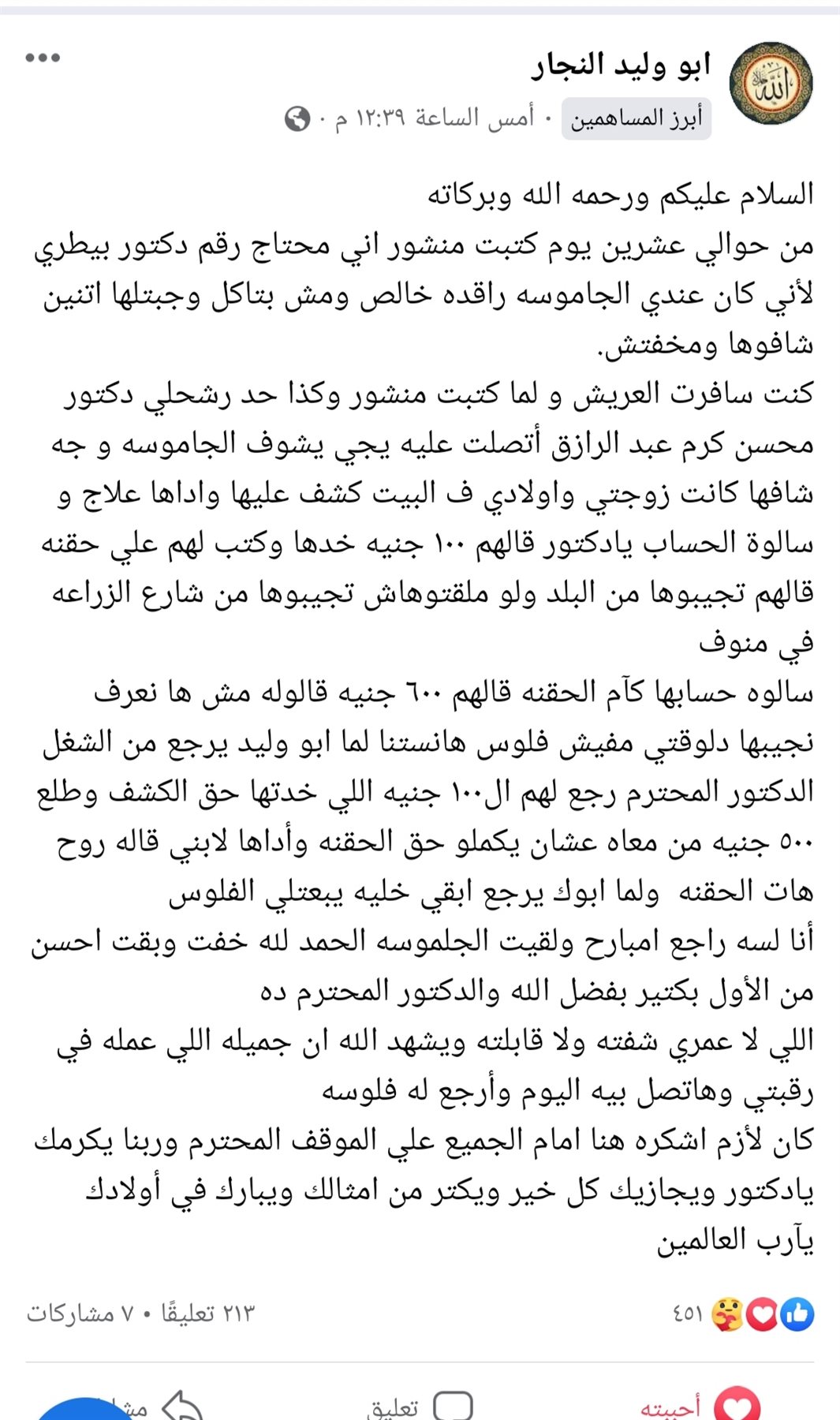وروى هذا الشخص القصة كاملة في البوست حيث كتب السلام عليكم ورحمة الله وبركاته، من حوالي عشرين يوم كتبت منشور إني محتاج رقم دكتور بيطري لأني كان عندي الجاموسة راقدة خالص ومش بتاكل وجبتلها اتنين شافوها ومخفتش، كنت سافرت العريش ولما كتبت منشور وكذا حد رشحلي دكتور محسن كرم عبد الرازق، اتصلت عليه يجي يشوف الجاموسة، وجه شافها كانت زوجتي وأولادي في البيت، كشف عليها واداها علاج، وسألوه الحساب يادكتور قالهم 100 جنيه، خدها وكتب لهم على حقنة قالهم تجيبوها من البلد ولو ملقتوهاش تجيبوها من شارع الزراعة في منوف.