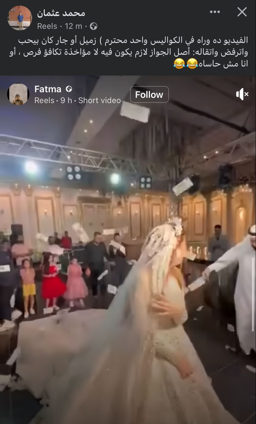 وقال محمد عثمان، أحد مستخدمي فيسبوك: الفيديو ده وراه في الكواليس واحد محترم، زميل أو جار كان بيحب واترفض واتقاله أصل الجواز لازم يكون فيه لا مؤاخذة تكافؤ فرص، أو أنا مش حاساه.