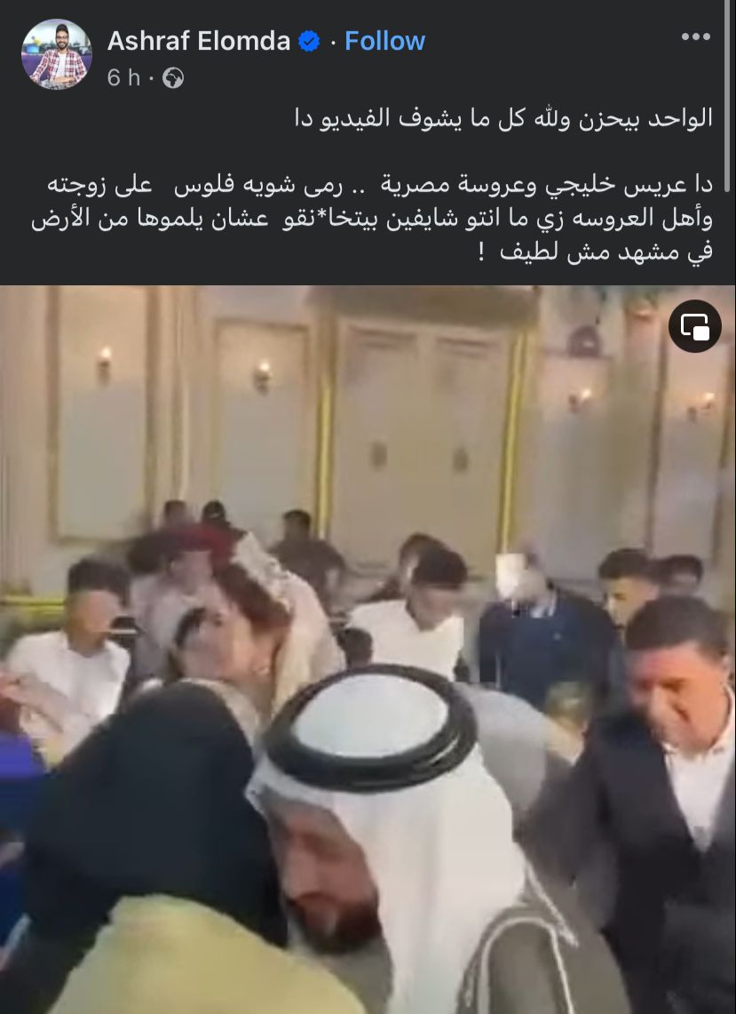 وعلق صاحب حساب على الفيديو المتداول عبر فيسبوك: الواحد بيحزن والله كل ما يشوف الفيديو.. دا عريس خليجي وعروسة مصرية رمى شوية فلوس على زوجته وأهل العروسة زي ما انتو شايفين بيتخانقوا عشان يلموها من الأرض في مشهد مش لطيف.