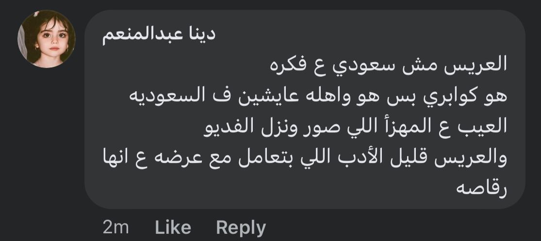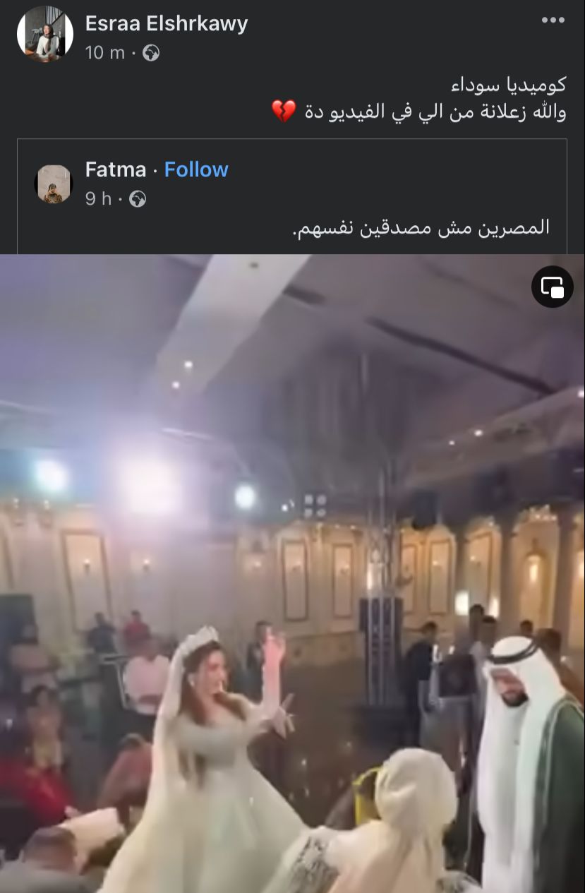 فيما كتب آخر، عبر صفحته الشخصية بفيسبوك: ملقتش عنوان مناسب.. أنا اتكسفت للعروسة بجد.. كوميديا سوداء والله زعلانة من اللي في الفيديو ده.