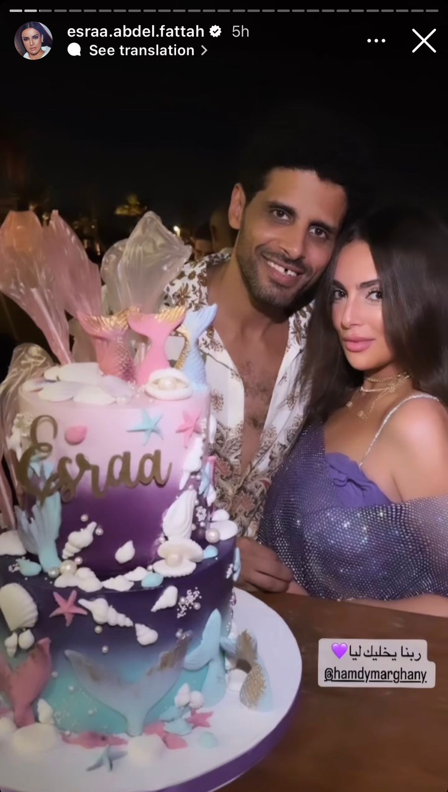 ونشرت نجمة مسرح مصر إسراء صورًا من احتفالها بعيد ميلادها مع زوجها وأصدقائها، عبر حسابها على انستجرام، وكتبت في استوري عبر انستجرام: بحبك جدًا، ربنا يخليك ليا.