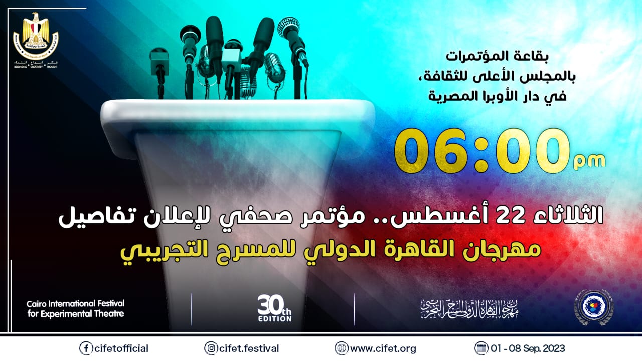 يعقد مهرجان القاهرة الدولي للمسرح التجريبي مؤتمرا صحفيا لإعلان تفاصيل الدورة الـ 30، في تمام الساعة السادسة مساء يوم الثلاثاء المقبل الموافق 22 أغسطس 2023، في قاعة المؤتمرات بالمجلس الأعلى للثقافة، بدار الأوبرا المصرية، بحضور الدكتور سامح مهران رئيس المهرجان، ومنسق عام المهرجان الدكتور محمد الشافعي، ومديرا المهرجان الدكتورة دينا أمين والدكتور أيمن الشيوي، وأعضاء اللجنة العليا ورؤساء اللجان التنفيذية، ويقدم المؤتمر مدير المركز الإعلامي للمهرجان الناقد مصطفى الكيلاني.
