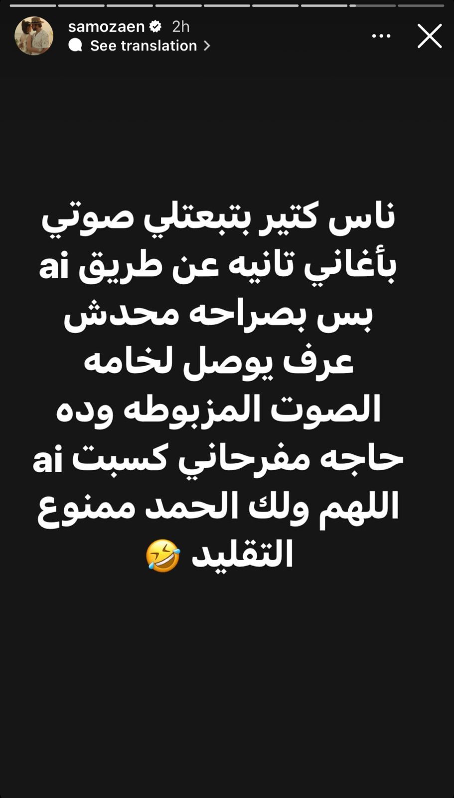 نشر سامو زين ستوري عبر موقع تبادل الصور والفديوهات القصيره انستجرام، وكتب الآتي: فيه ناس كتير بتبعتلي صوتي وأنا بغني أغاني تانيه عن طريق الذكاء الأصطناعي بس بصراحه محدش عرف يوصل لخامه الصوت المزبوطه وده حاجه مفرحاني