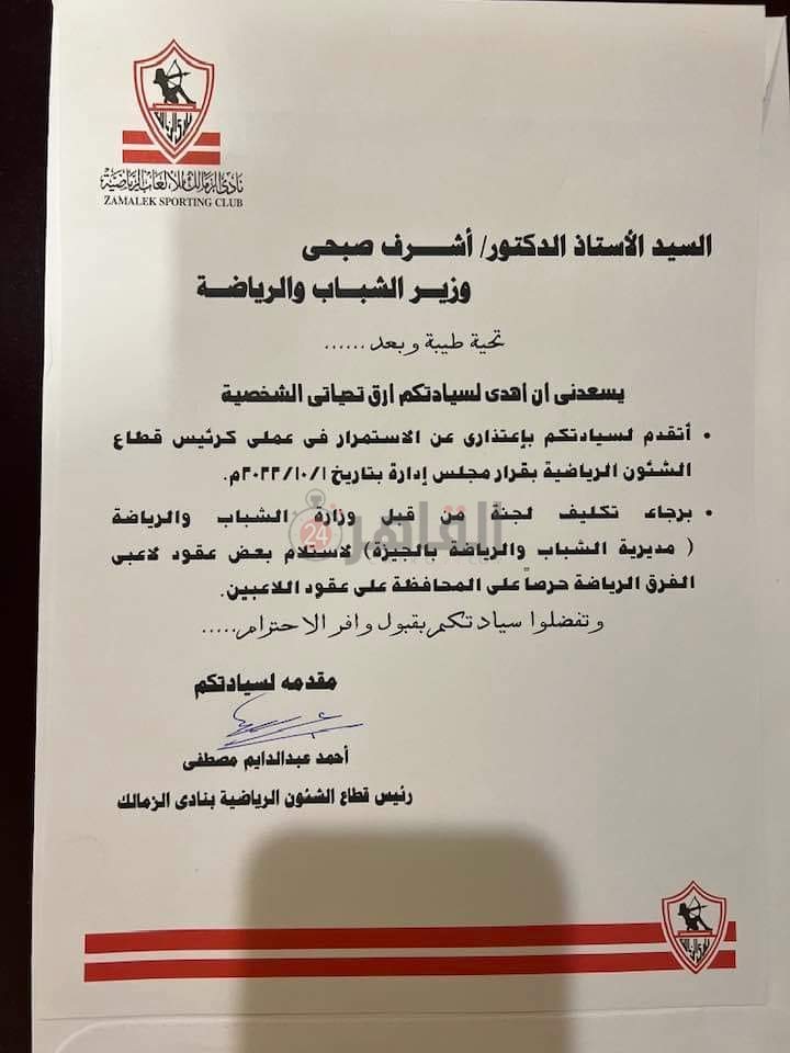 مدير النشاط الرياضي في الزمالك يتقدم باستقالته | مستند