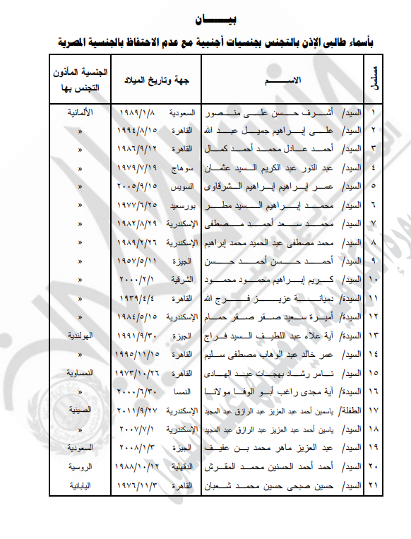 ونصت المادة الأولى على أن يُؤذن لكل من الواحد والعشرين مواطنا، أولهم أشرف حـسـن علي منصور وآخرهم حسين صبحى حسين محمد شعبان المدرجة أسماؤهم بالبيان المرفق بالتجنس بالجنسية الأجنبية الموضحة قرين اسم كل منهم، مع عدم الاحتفاظ بالجنسية المصرية.