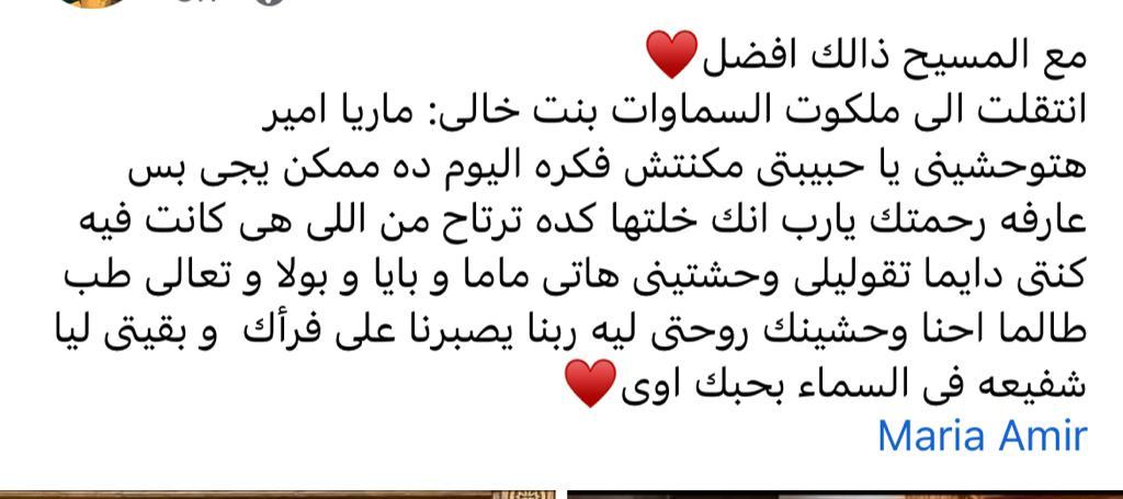 فيما نعاها آخر: مع المسيح ذلك أفضل، هتوحشيني يا حبيبتي مكنتش فاكرة اليوم ده ممكن ييجي بس عارفة رحمتك يا رب انك خلتها كده ترتاح من اللي هي كانت فيه كنتي دايما تقوليلى وحشتيني هاتي ماما وبابا وبولا وتعالي، طب طالما احنا وحشينك روحتي ليه، ربنا يصبرنا على فراقك وبقيتى ليا شفيعه في السماء بحبك أوي.