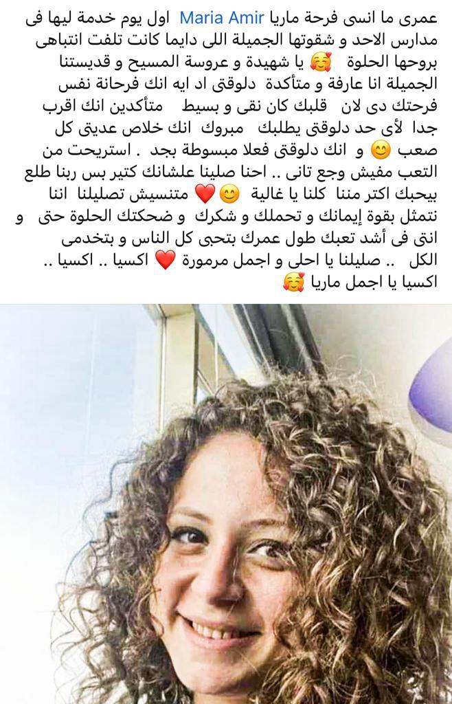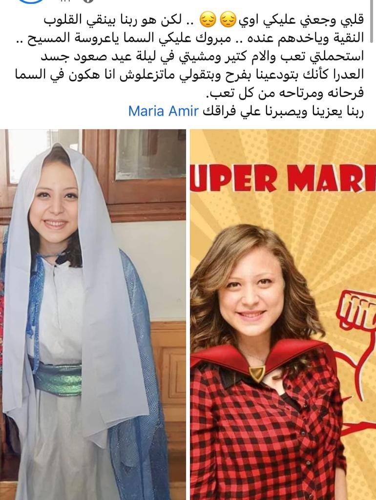 وكتب إحدى صديقاتها: عمري ما أنسى فرحة ماريا أول يوم خدمة ليها في مدارس الأحد، وشقاوتها الجميلة اللي دايما كانت تلفت انتباهي بروحها الحلوة، يا شهيدة وعروسة المسيح وقديستنا الجميلة أنا عارفة ومتأكدة دلوقتي قد إيه انك فرحانة نفس فرحتك دي لأن قلبك كان نقي وبسيط، متأكدين انك اقرب جدا لأى حد دلوقتى يطلبك مبروك انك خلاص عديتى كل صعب، وانك دلوقتي فعلا مبسوطة بجد. استريحت من التعب مفيش وجع تاني.. احنا صلينا علشانك كتير بس ربنا طلع بيحبك أكتر مننا كلنا يا غالية، متنسيش تصليلنا اننا نتمثل بقوة إيمانك وتحملك وشكرك وضحكتك الحلوة حتى وانتي في أشد تعبك طول عمرك بتحبي كل الناس وبتخدمي الكل.. صليلنا يا أحلى وأجمل مرمورة.