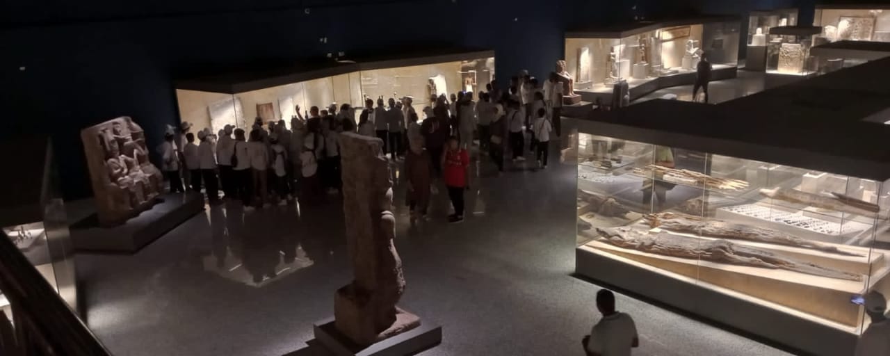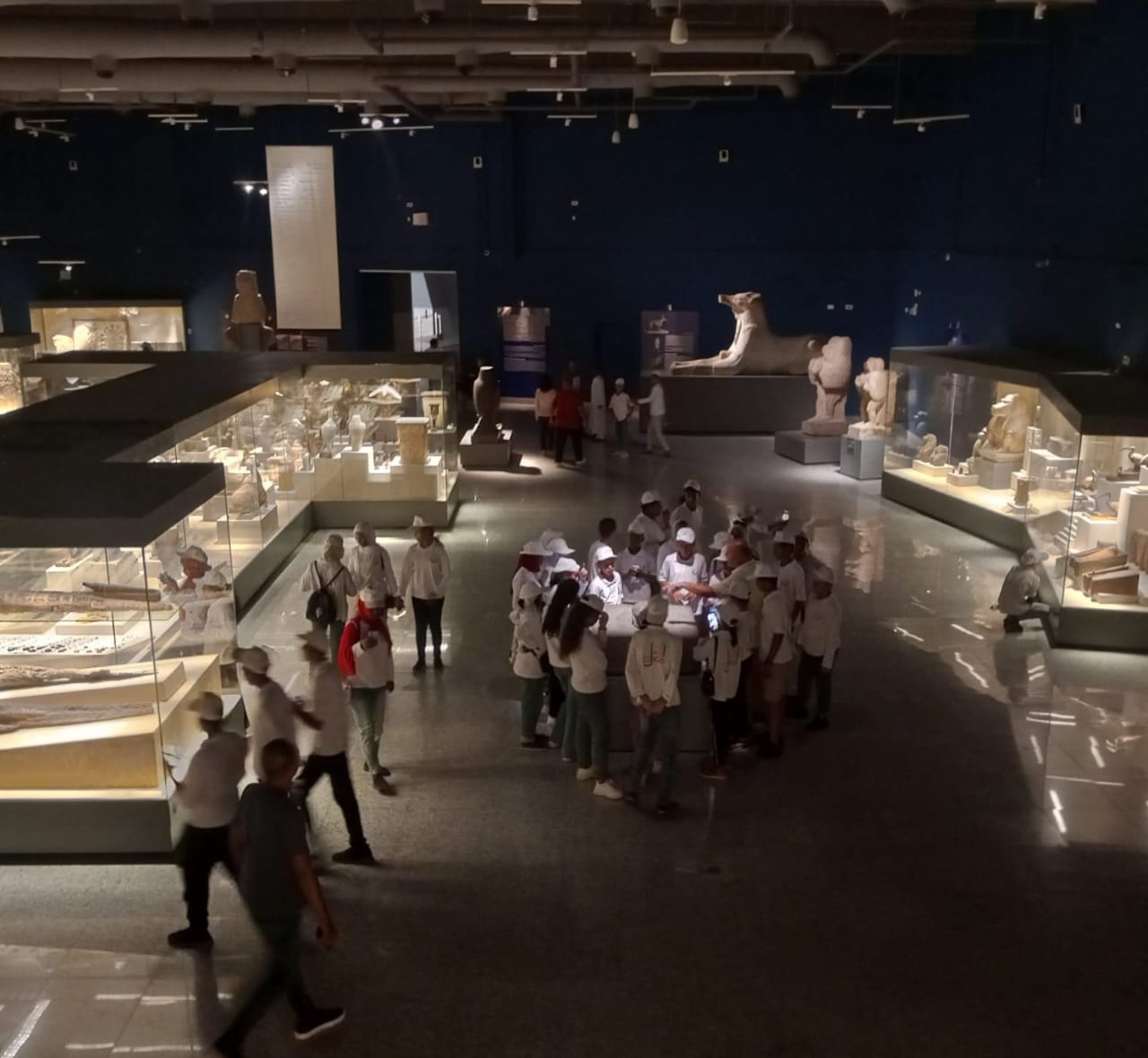 بدأت أولى الزيارات التثقيفية بتفقد أروقة المتحف الذي تضم جدرانه ملامح من الحياة في مصر القديمة، وأهمية نهر النيل في حياة المصريين على مر العصور، وكذلك مراكب الشمس المسئولة عن نقل الملوك من عالم الدنيا للآخرة، وفي قاعة محاكاة المقبرة تعرف الأطفال على طقوس التحنيط لدى المصريين التي تتضمن الأواني الكانوبية وتماثيل الأوشابتي المسؤولة عن الخدمة في العالم الآخر، وتمثال أنوبيس، وحلي المومياوات زرقاء اللون تأثرًا بلون النيل والسماء.