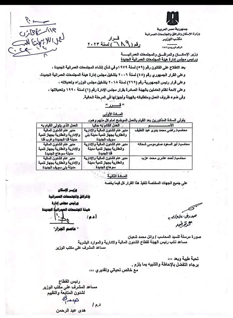 نص قرار وزير الإسكان على تولي المحاسب راضي محمد بدوي عبد اللطيف، مدير عام الشئون المالية والإدارية والعقارية بجهاز تنمية مدينة بني سويف الجديدة، ليتولى مدير عام الشئون المالية والإدارية والعقارية بجهاز تنمية مدينة قنا الجديدة وغرب قنا، ونقل المحاسب أبو السعود صابر موسى شحاتة، مدير عام الشئون المالية والإدارية والعقارية بجهاز تنمية مدينة قنا الجديدة، ليتولى مدير عام الشئون المالية والإدارية والعقارية بجهاز تنمية مدينة سوهاج الجديدة.