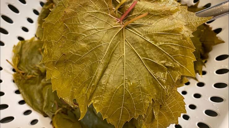 - يتم نزع العروق من ورق العنب والتخلص من أي أوراق قديمة بها إصفرار أو ثقوب.