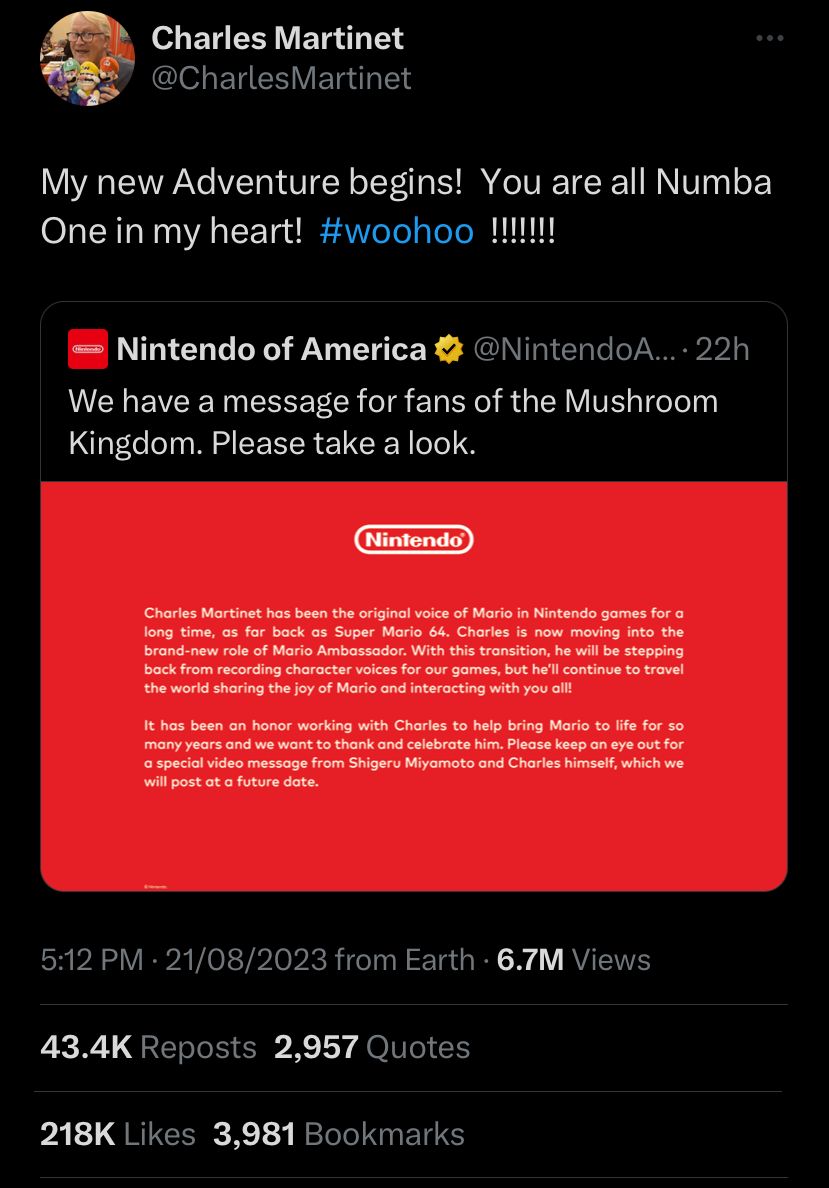 وشارك مارتينيت متابعيه عبر موقع إكس المعروف بـ تويتر سابقًا، تدوينة شركة نينتندو، حيث كتب: مغامرتي الجديدة تبدأ.. أنتم جميعا رقم واحد في قلبي.