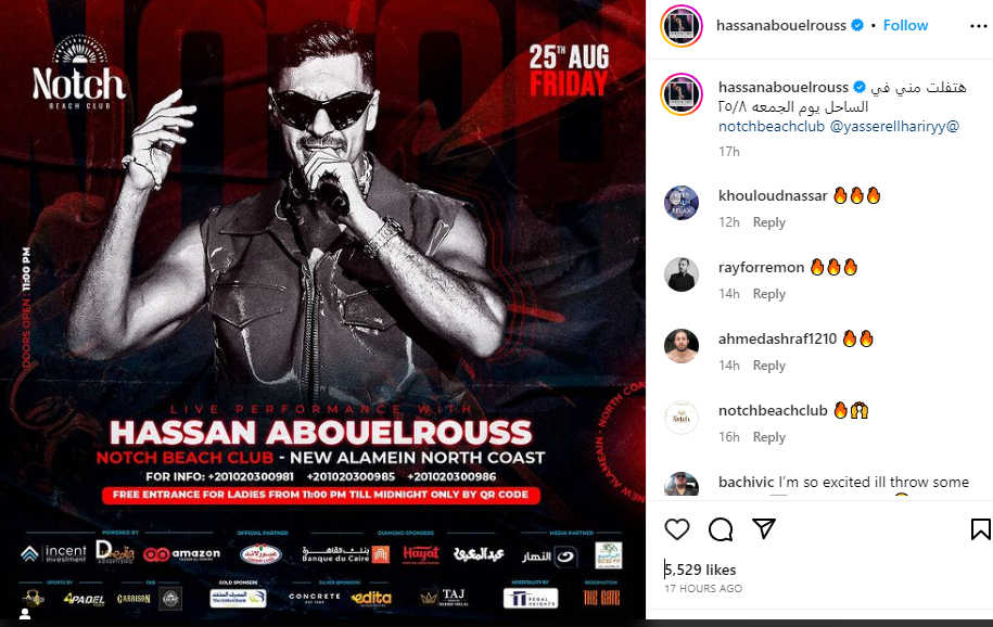 دخول السيدات فقط مجانًا.. أبرز شروط حفل حسن أبو الروس في الساحل الشمالي