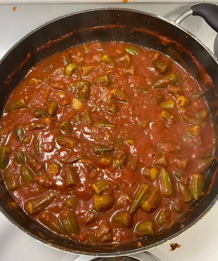 - يضاف البامية النظيفة مع الفلفل الرومي وتترك على النار إلى أن تصبح ناضجة.