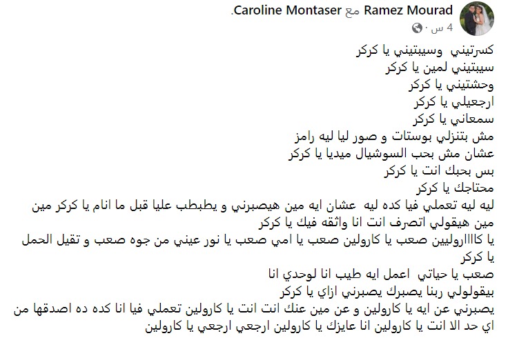 وأضاف: محتاجك، ليه تعملي فيا كده ليه عشان ايه مين هيصبرني، ويطبطب عليا قبل ما أنام، مين هيقولي اتصرف أنت أنا واثقة فيك.. يا كاروليين صعب يا كارولين صعب.. يا أمي صعب يا نور عيني من جوه صعب وتقيل الحمل.