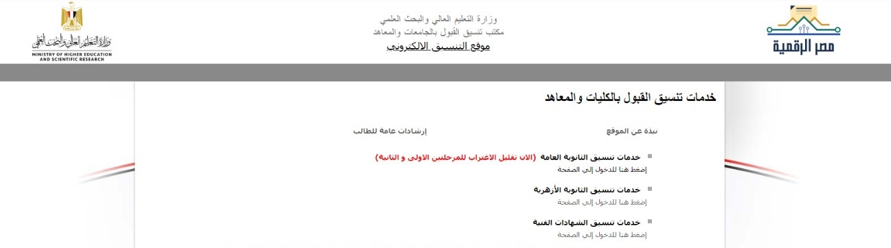 فتح موقع التنسيق الإلكتروني، صباح اليوم الخميس، لطلاب الثانوية العامة بالمرحلتين الأولى والثانية من تنسيق القبول بالجامعات 2023، من أجل التحويل بين الكليات والمعاهد ضمن تقليل الاغتراب 2023.