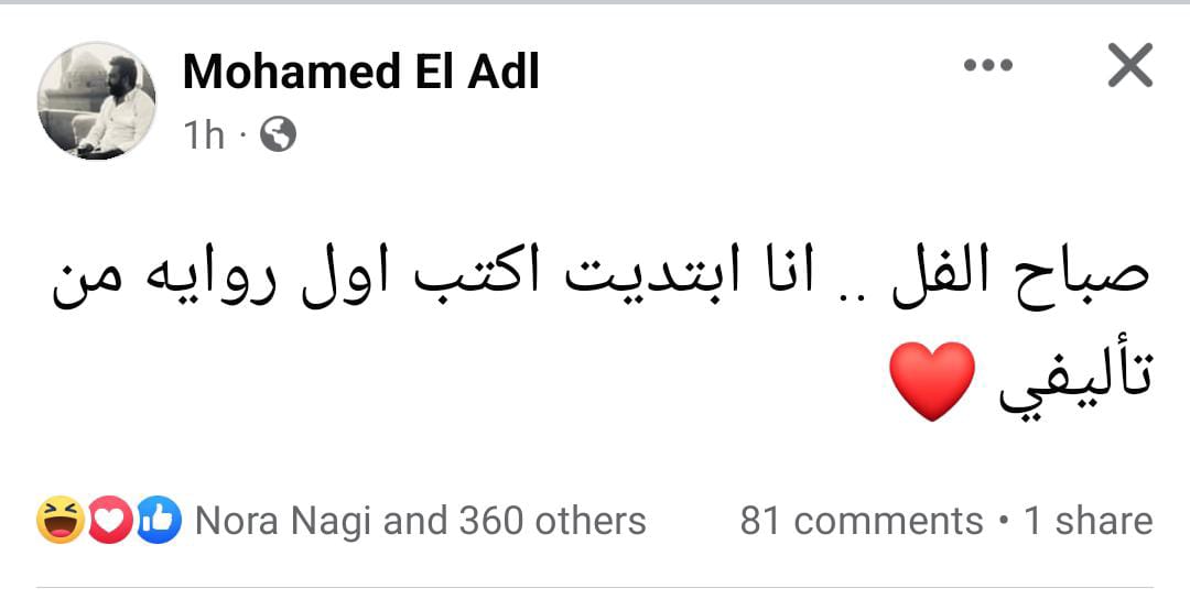 كتب ماندو العدل، منشورًا، عبر حسابه الشخصي بموقع التواصل الاجتماعي فيسبوك، حيث قال: صباح الفل.. أنا ابتديت أكتب أول رواية من تأليفي.