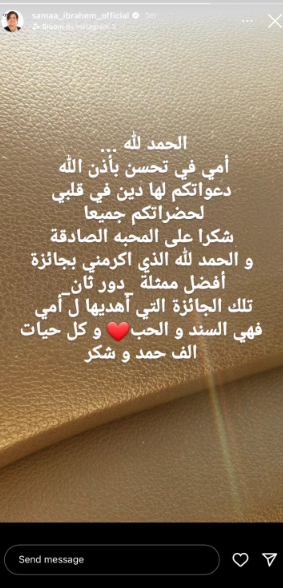 وكتبت سما إبراهيم، منشورًا عبر حسابها الشخصي بموقع تبادل الصور والفيديوهات القصيرة، انستجرام، جاء فيه: الحمد لله أمي في تحسن بإذن الله، دعواتكم لها دين في قلبي لحضراتكم جميعا.. شكرًا على المحبة الصادقة.