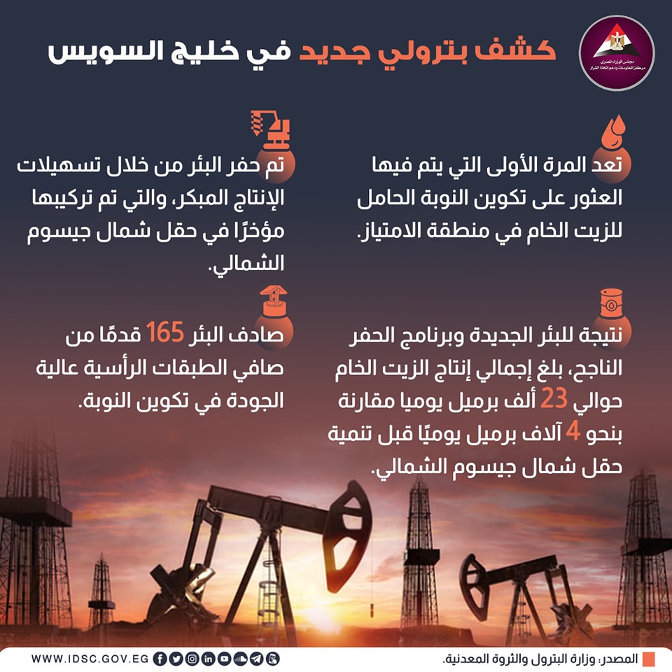 سلط مركز المعلومات ودعم اتخاذ القرار في مجلس الوزراء الضوء على، الكشف البترولي في خليج السويس، والتي تعد المرة الأولى التي يتم فيها العثور على تكوين النوبة الحامل للزيت الخام في منطقة الامتياز.