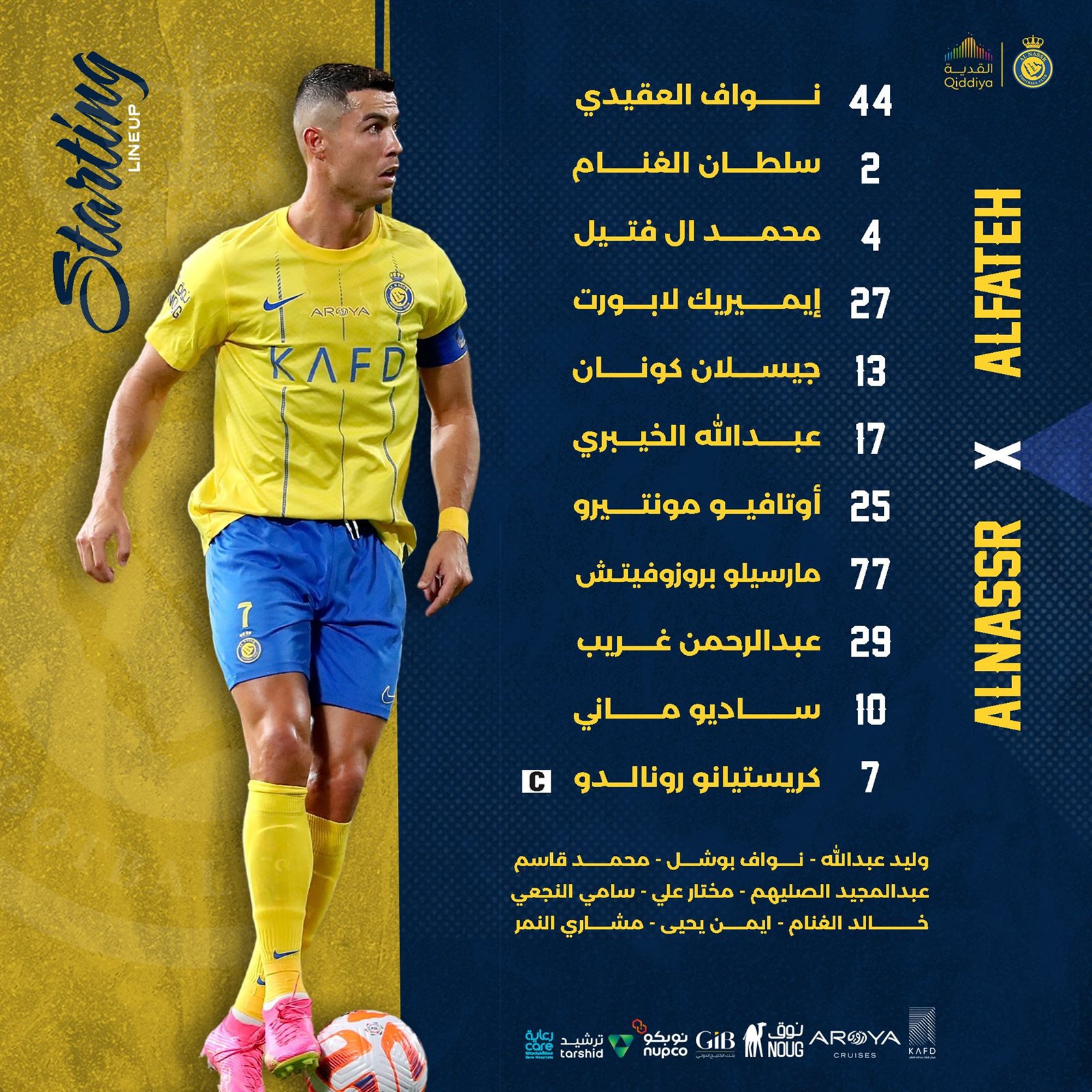 وشهد تشكيل النصر لمواجهة الفتح بالدوري السعودي، مشاركة النجم البرتغالي كريستيانو رونالدو والسنغالي ساديو ماني، بالإضافة إلى لاعب الوسط الكرواتي بروزوفيتش، والمدافع الإسباني إيمريك لابورت.