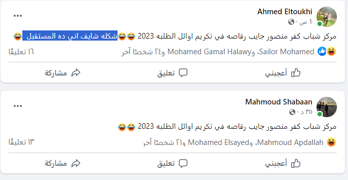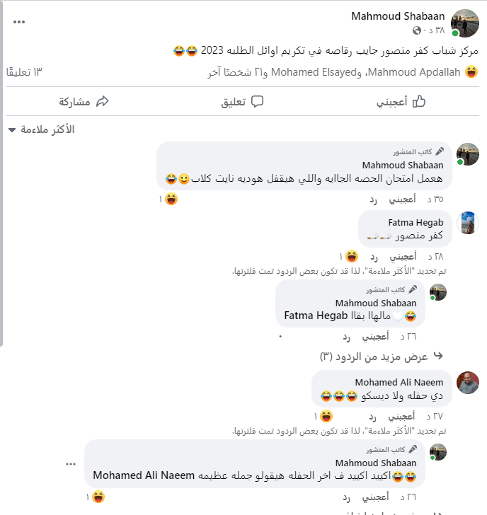 وكتب أحمد الطوخي أحد شباب قرية كفر منصور تعليق على وجود الراقصة بحفل تكريم أوائل الثانوية العامة، قائلا: شكل مركز الشباب شايف أن ده المستقبل.