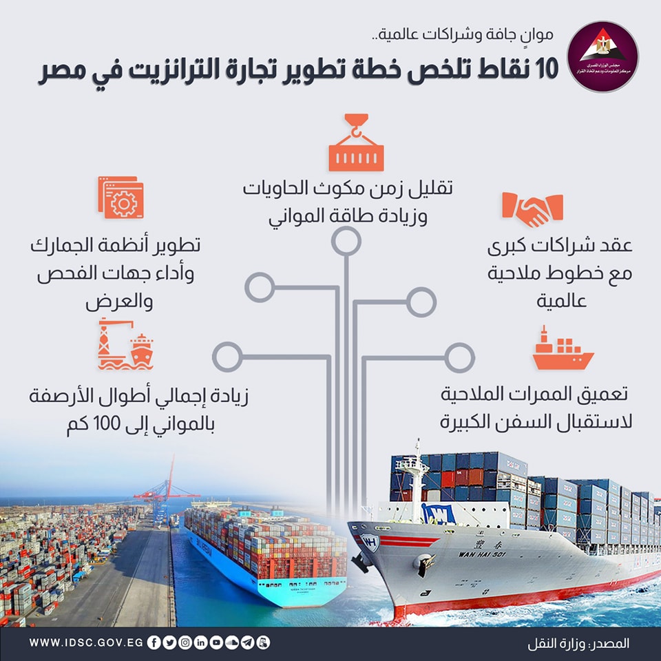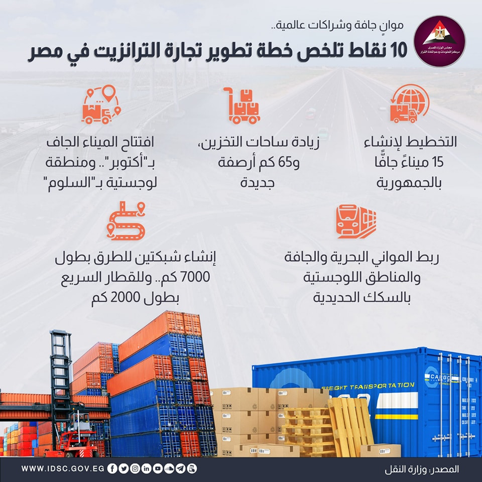 كشف مركز المعلومات ودعم اتخاذا القرار التابع لـ مجلس الوزراء عن 10 نقاط تلخص خطة تطوير تجارة الترانزيت في مصر، موضحا أنه تم التخطيط لإنشاء 15 ميناء جافا بالجمهورية، إلى جانب زيادة ساحات التخزين و65 كم أرصفة جديدة، فضلا عن افتتاح الميناء الجاف بأكتوبر، ومنطقة لوجستية بالسلوم.