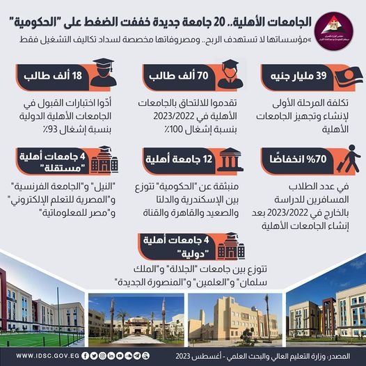 ولفت مركز المعلومات، إلى أن 20 جامعة أهلية جديدة خففت الضغط على الحكومية، في حين بغلت تكلفة المرحلة الأولى لإنشاء وتجهيز الجامعات الأهلية بلغ 39 مليار جنيه، كما تقدم قرابة 70 ألف طالب للالتحاق بالجامعات الأهلية في 2022/ 2023 بنسبة إشغال 100%.