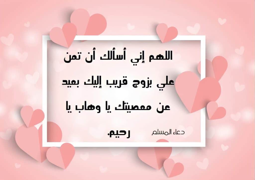 - اللهم ارزقني زوجًا صالحا، واجعل بيننا من المودة والرحمة أفضلها، وارزقنا الصبر والحلم أكمله، واجعلنا على منابر من نور، وأسعدني معه وبقربه في الدنيا وفي جنة السرور، واهدنا يا الله لما فيه الخير والصلاح، وارحمنا برحمتك يا أرحم الراحمين.