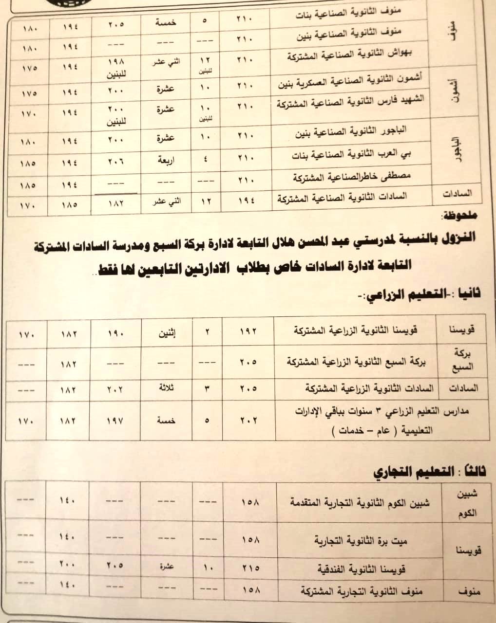 وسبق وأن قرر اللواء إبراهيم أبو ليمون محافظ المنوفية، النزول بدرجات القبول في المدارس الثانوية، طبقا للأعداد المتقدمة للمدارس، وتسهيلا على أولياء الأمور من أبناء المحافظة في كافة المراكز.