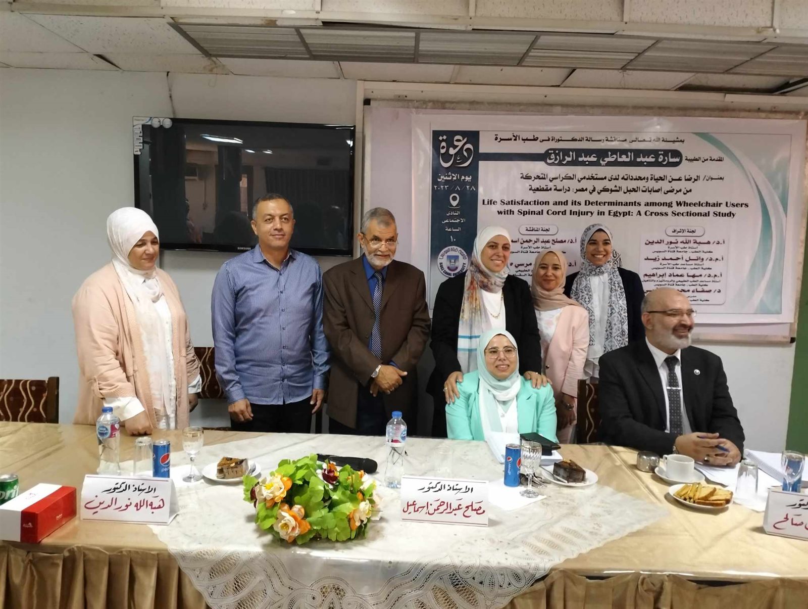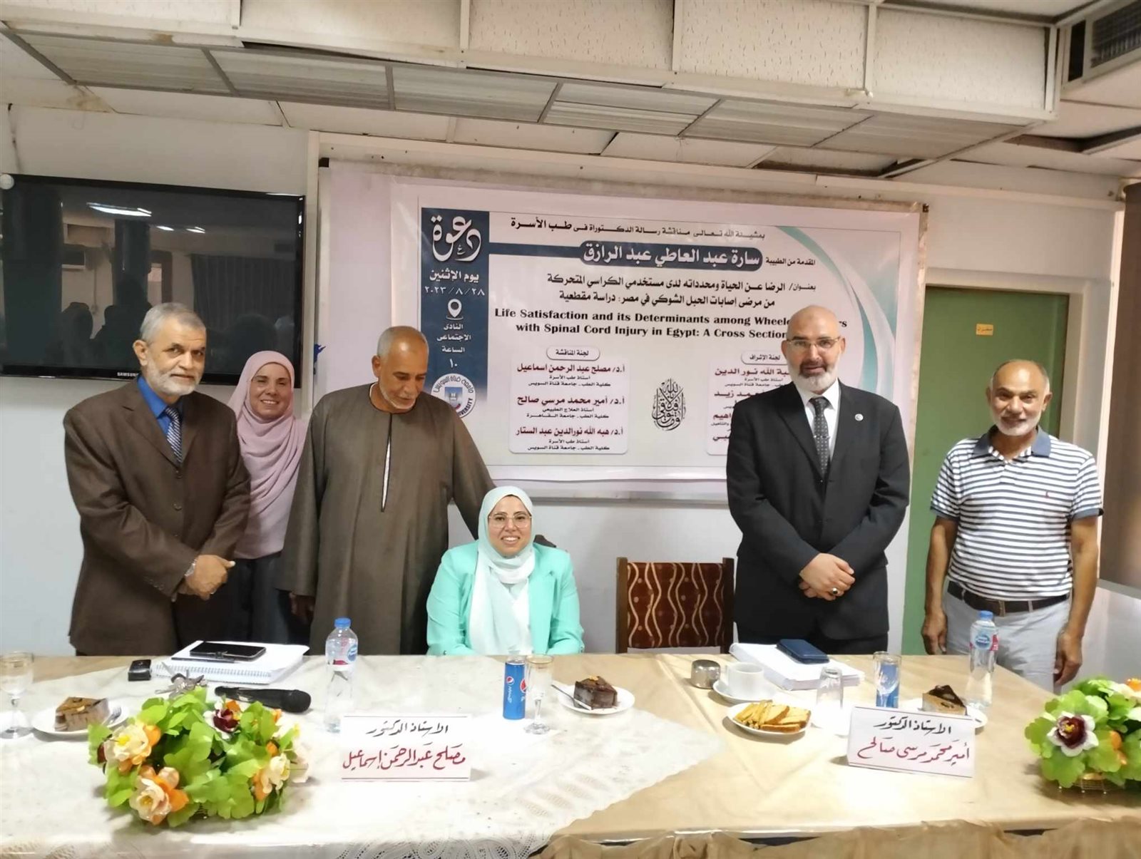 وتشكلت لجنة مناقشة رسالة الدكتوراة من الدكتورة هبة الله نور الدين أستاذ طب الأسرة بكلية الطب البشري بجامعة قناة السويس (رئيسًا ومشرفًا)، والدكتور أمير محمد مرسي صالح عميد كلية العلاج الطبيعي السابقى بجامعة القاهرة، ووالدكتورمصلح عبد الرحمن إسماعيل رئيس قسم طب الأسرة بكلية الطب البشري بجامعة قناة السويس.