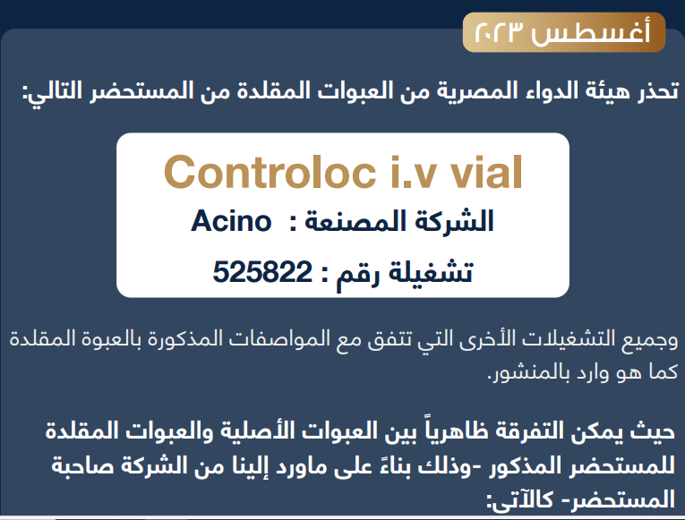 وأوضحت هيئة الدواء المصرية، في منشور لها، أن العبوات المقلدة من حقنة كونترولوك في التشغيلة رقم 525822، مشيرة إلى الفروق الظاهرية بين المقلدة منها والأصلي، حيث تحمل العبوات المقلدة رقم بريدي 79467، ودرجة الحرارة المدونة على الفيل 25ZC.