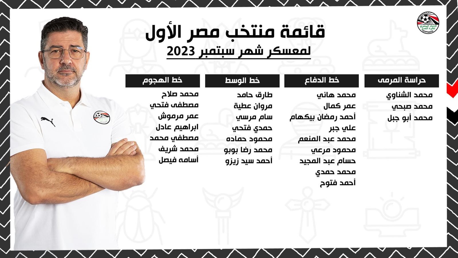ويغيب من الـ 10 لاعبين السالف ذكرهم عن قائمة منتخب مصر كل من: مهند لاشين، محمود كهربا بالإضافة إلى محمود حسن تريزيجيه وأحمد حجازي للإصابة.