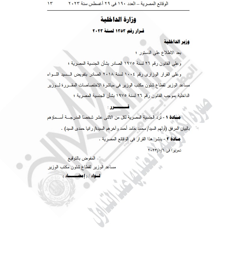 وجاء قرار الجريدة الرسمية بعد الاطلاع على الدستور؛ وعلى القانون رقم 26 لسنة 1975 الصادر بشأن الجنسية المصرية؛ وعلى القرار الوزاري رقم 1004 لسنة 2018 الصادر بتفويض السيد اللواء مساعد الوزير لقطاع شئون مكتب الوزير في مباشرة الاختصاصات المقررة لوزير الداخلية بموجب القانون رقم 26 لسنة 1975 بشأن الجنسية المصرية ترد الجنسية المصرية لكل من الاثنى عشر شخصا المدرجة أسماؤهم بالبيان المرفق (أولهم محمد حامد أحمد وآخرهم/ رانيا حمدي السيد.