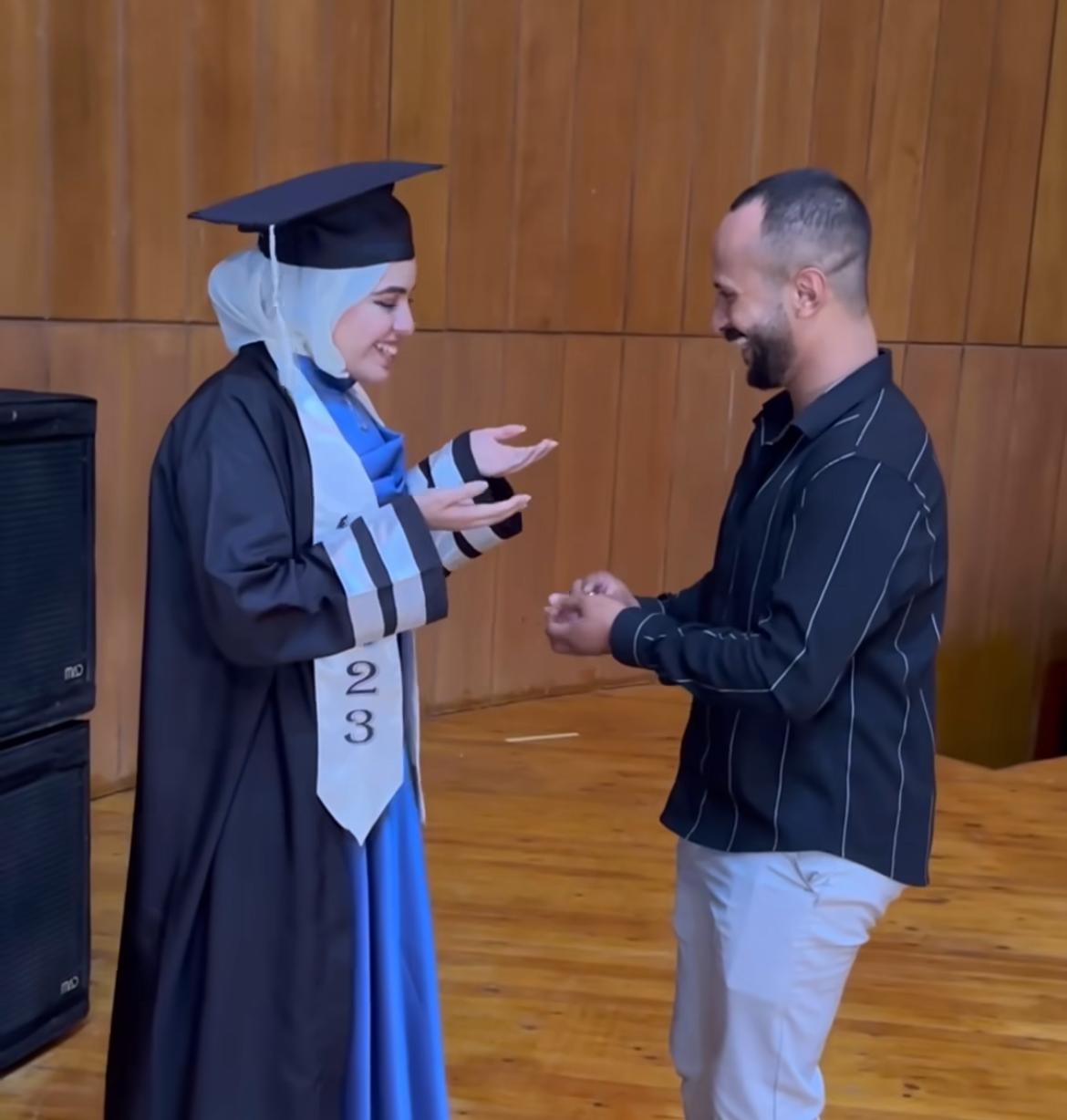 وأضافت دنيا طراق: هو حب يفرحني بما إن السنة اللي فاتت كنت مكتأبة، وهو حب يفرحني، عملي المفاجأة ديه، وقدم لي الدبلة خلال تكريمي في حفل التخرج الخاصة بكلية الآداب قسم الفلسفة جامعة القاهرة، وتم ذلك بالاتفاق مع بابا.